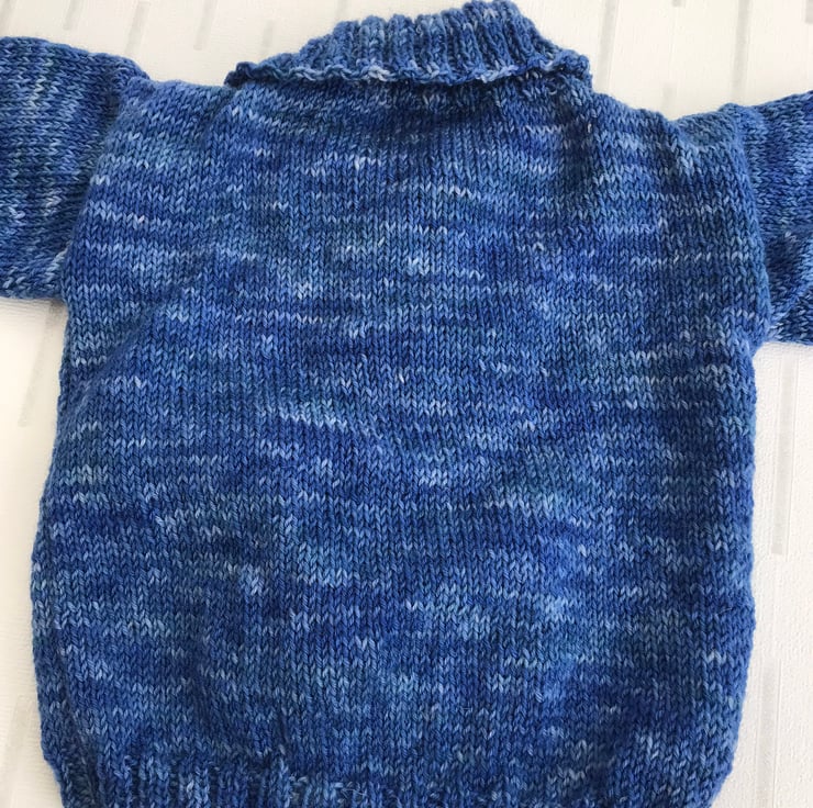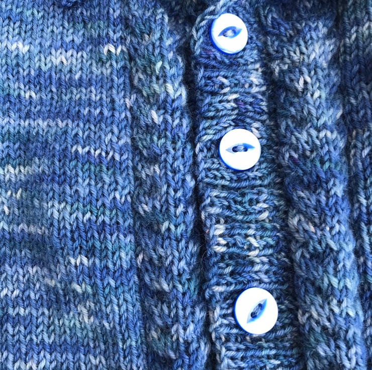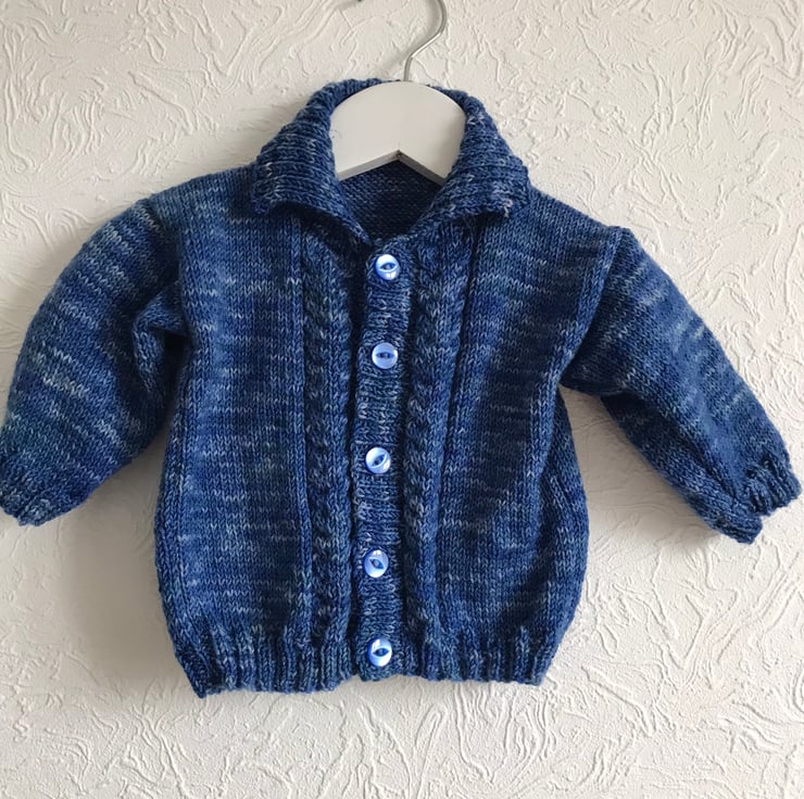 This beautiful cardigan is hand knitted in a hand dyed 4ply yarn. The cardigan has a cable border up the fronts and has a collar. The bands, ribs and collar are worked in a double rib and it fasten at the front with five blue buttons.