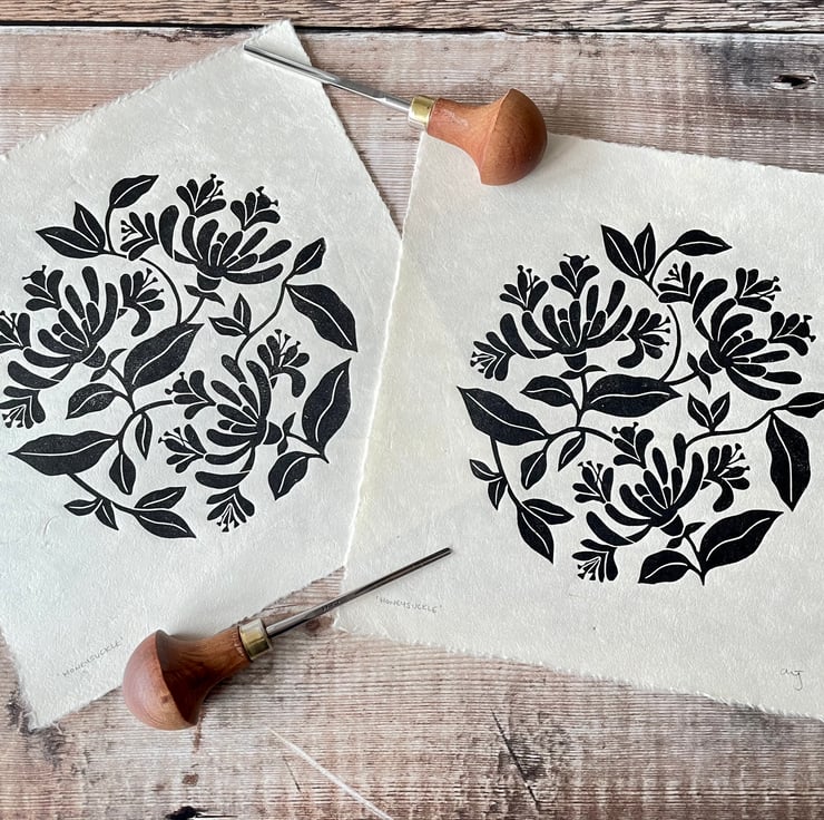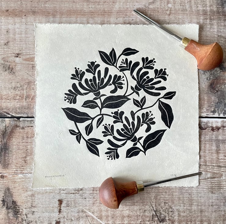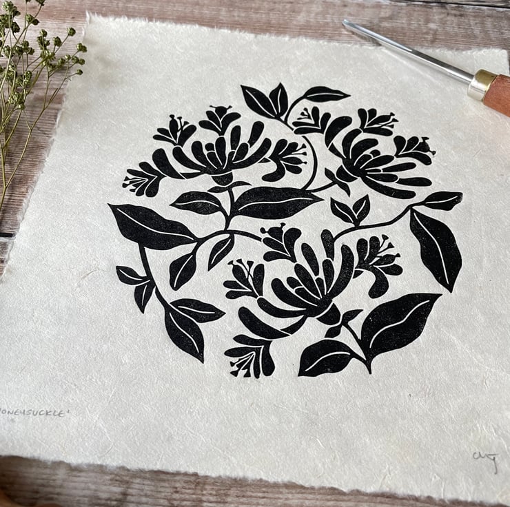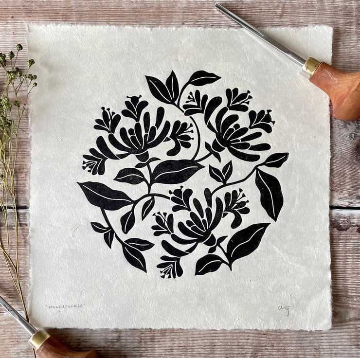 An original linocut and design of the honeysuckle flower, printed in black ink onto natural Nepalese Mitsumata washi paper.