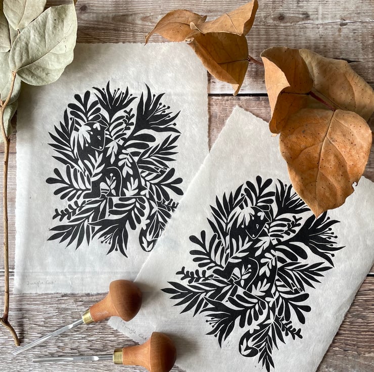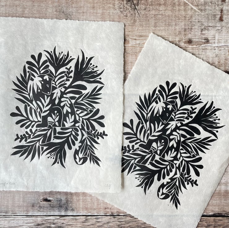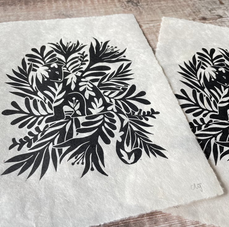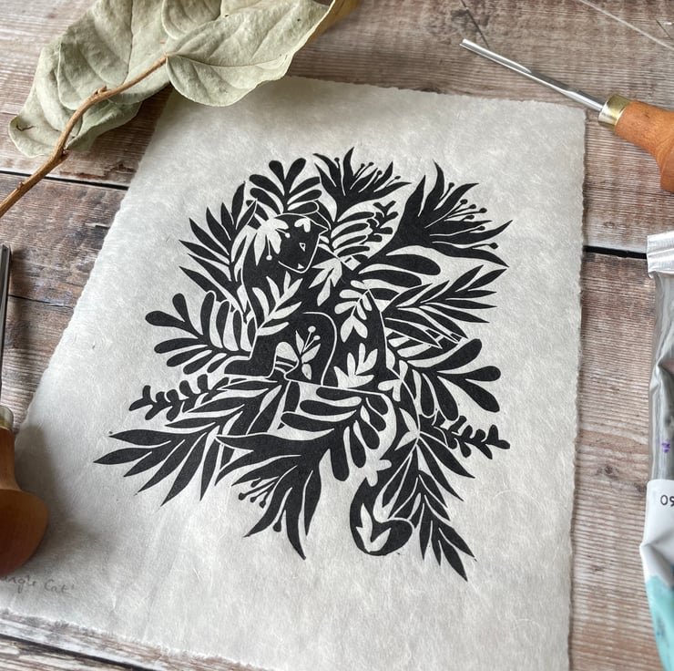An original linocut and design of a big cat camouflaged within jungle leaves, printed in black ink onto natural Nepalese washi paper.