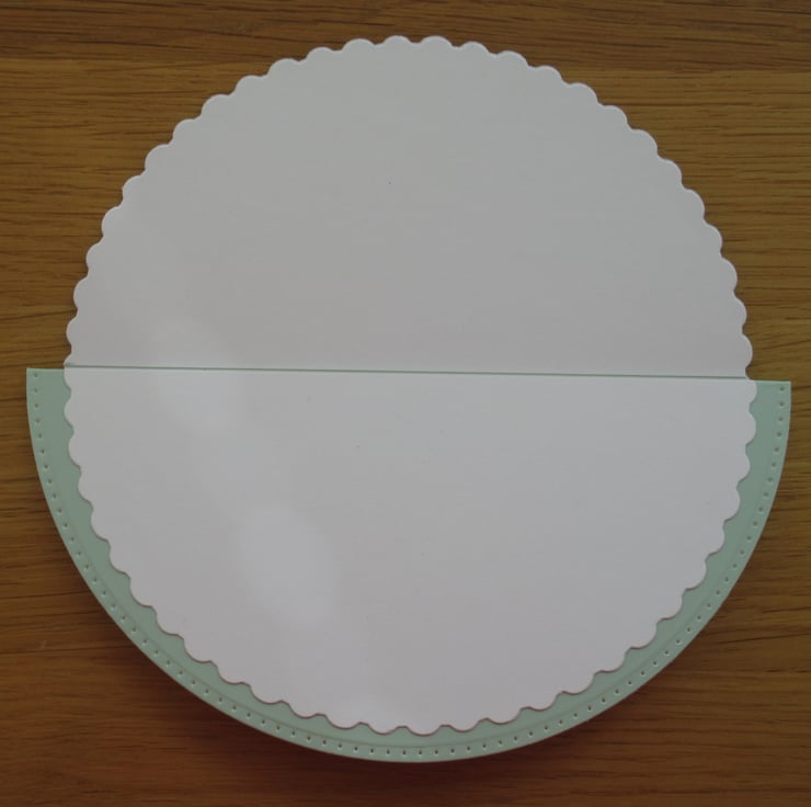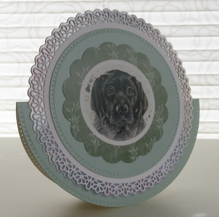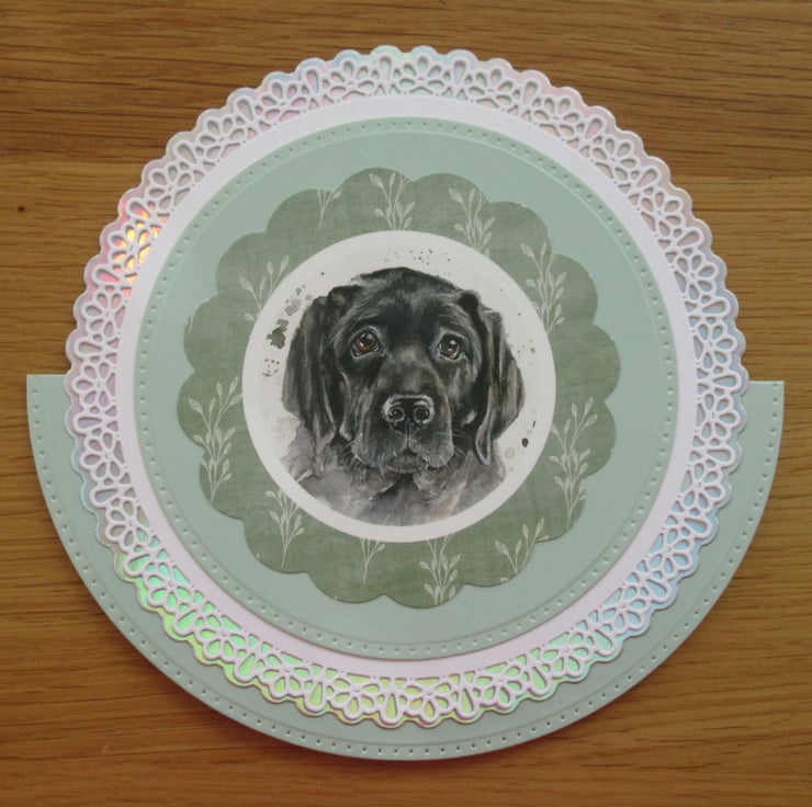 This circular card is also a rocking card and features the lovely image of a black labrador. I have used circular dies to create the card base and its many layers, using soft green, white and silver rainbow mirror card. The card cannot be opened fully due to an inside tab which stops the card from splaying open, but the back has been designed as somewhere for your message to be written.