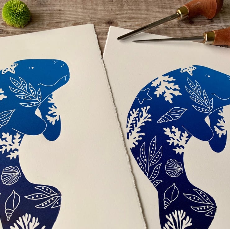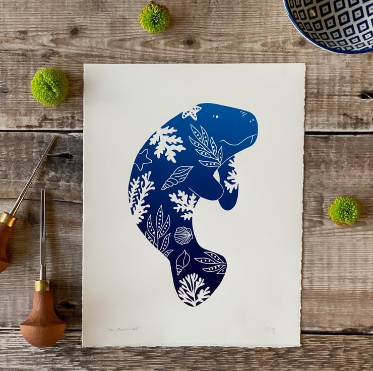 Manatee / sea cow original linocut, in a deep ocean blue gradient with sea pattern.