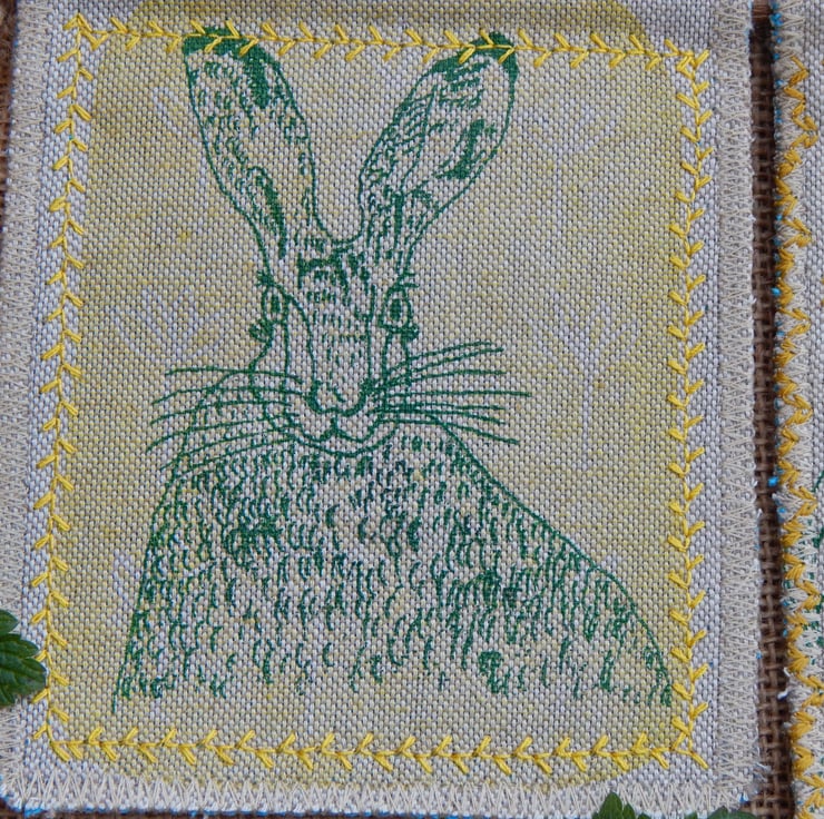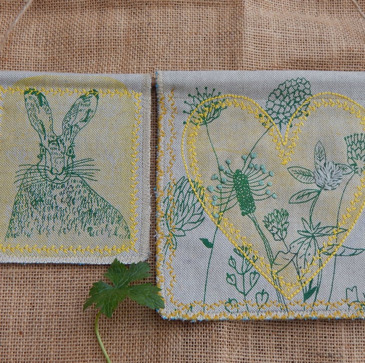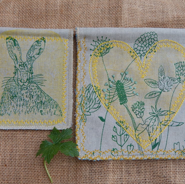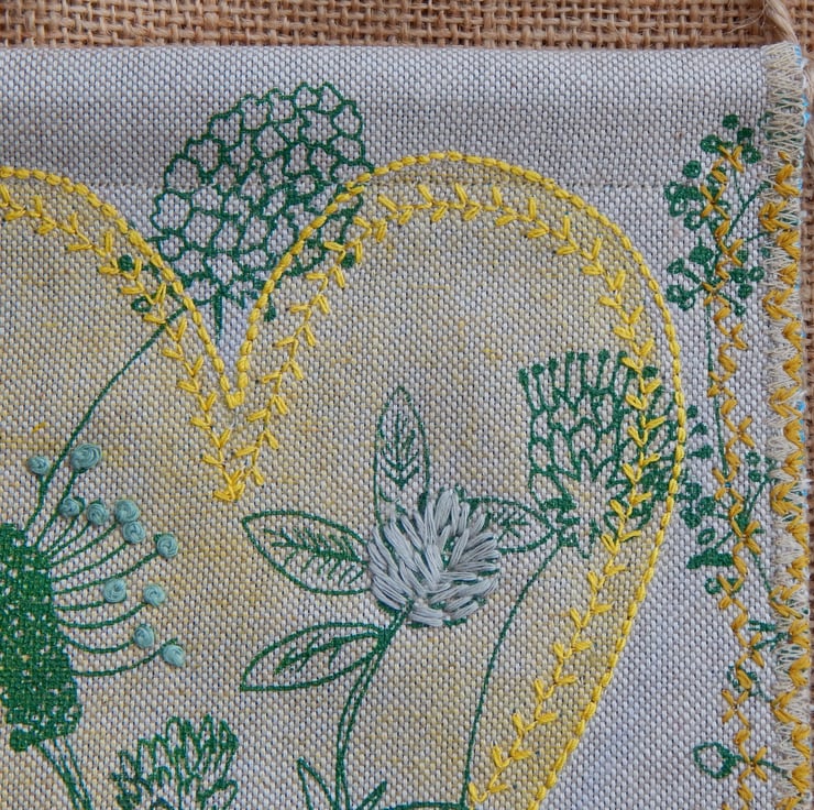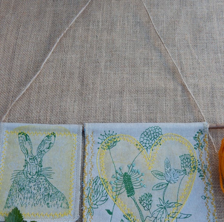 This is a hare screen printed onto a simple deep yellow llino print, on a piece of medium weight cotton. This has a couple of layers of cotton fabric for some stability and this is sewn onto a piece of willow, a simple hanging loop is made with a piece of hemp string connected from one end of the willow to the other. There is also a screen print of hedgerow flowers with a heart lino printed, some of the flowers have hand embroidery for a pop of colour.