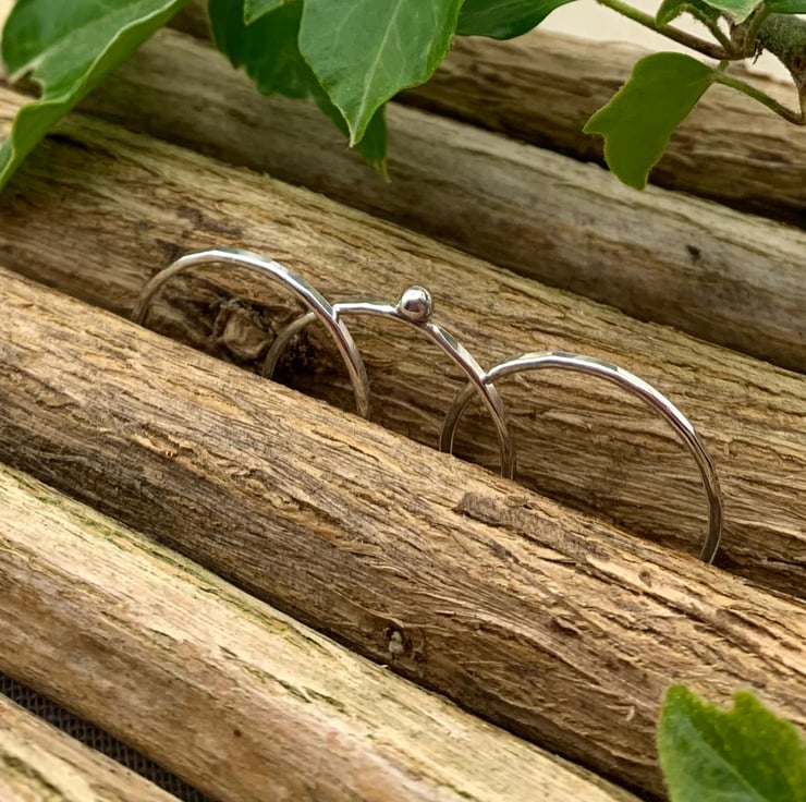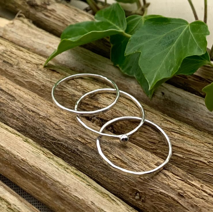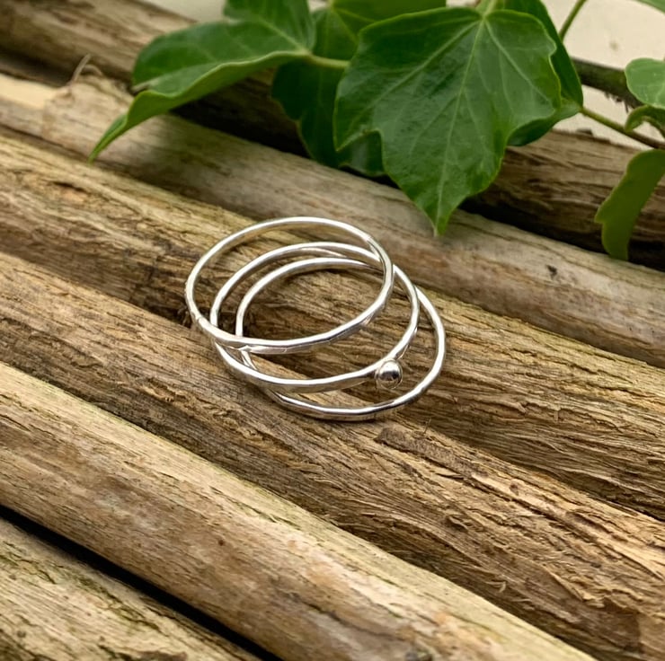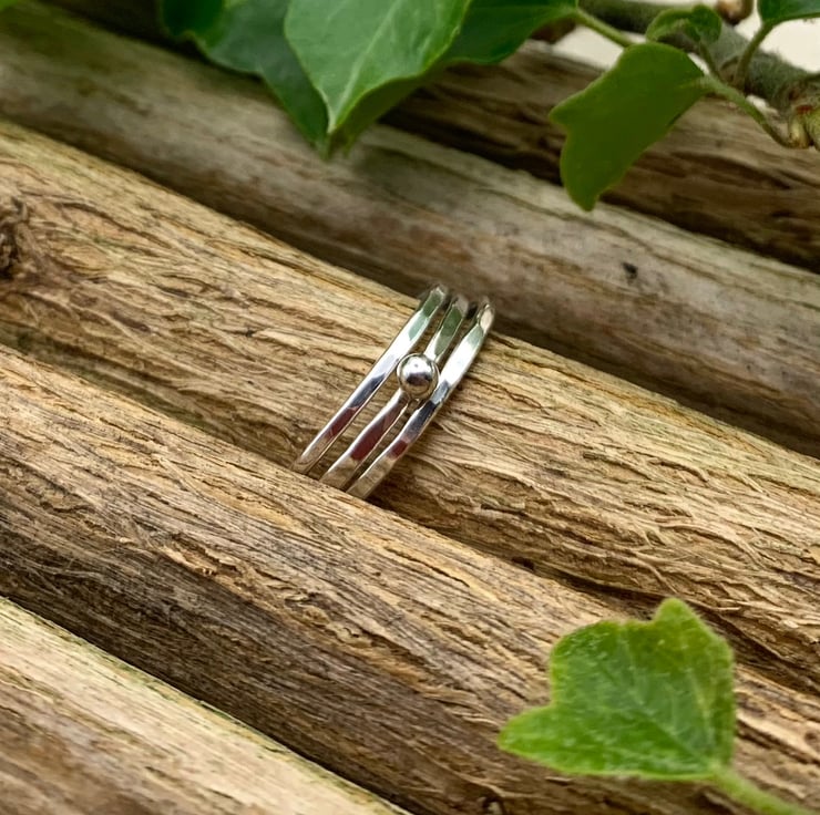 In this stack you’ll get three rings: two plain hammered bands and one ring with a silver granule to give a little focal point of interest.