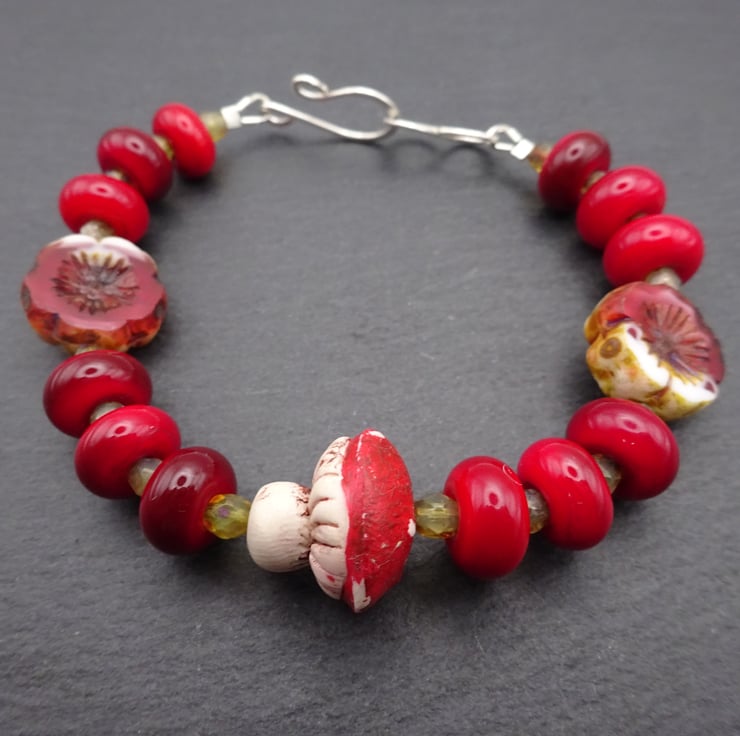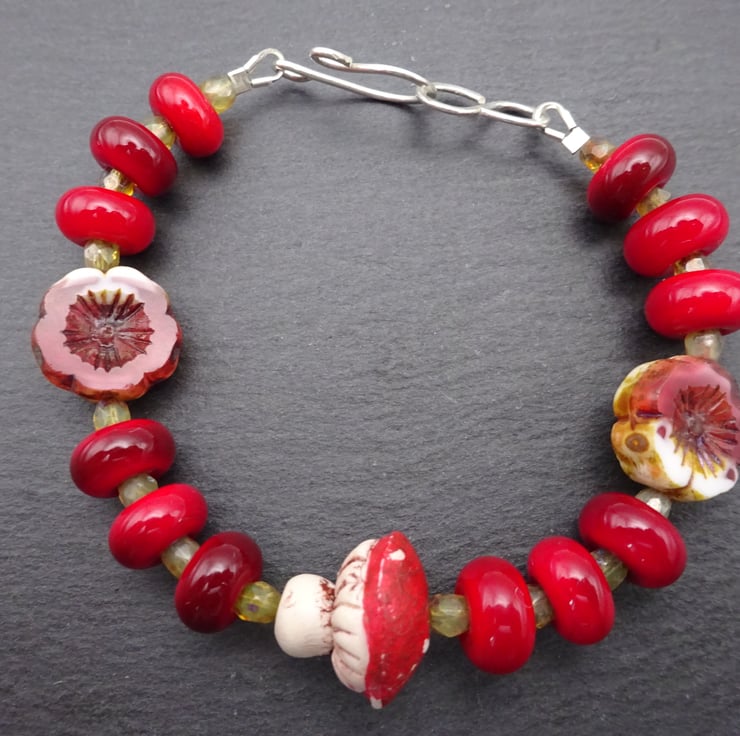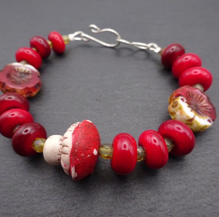 A bracelet made with a handmade polymer clay toadstool beads, handmade lampwork glass beads and Czech glass beads. The bracelet fastens with a handmade sterling silver hook.
