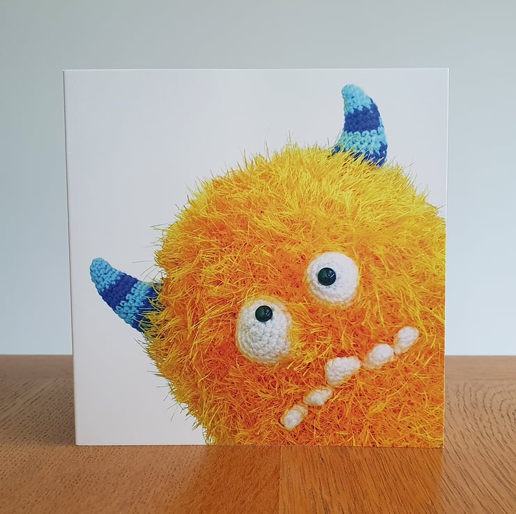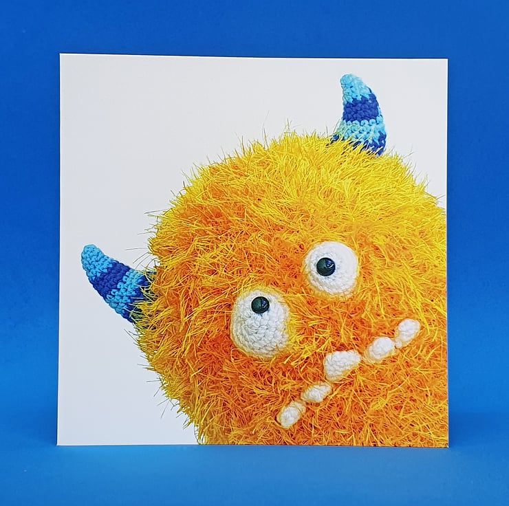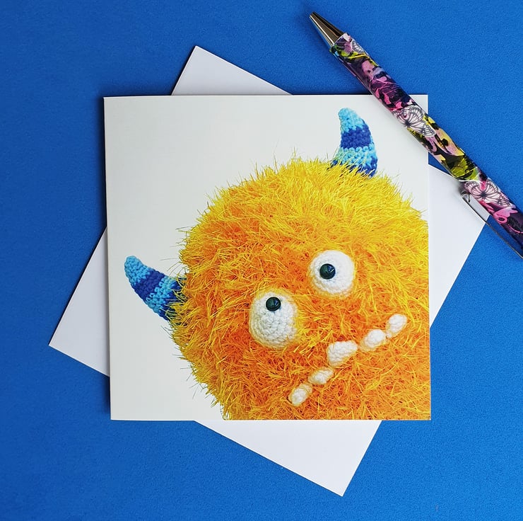 Who doesn't love a monster! Especially a super fluffy goofball like this one! A card to suit all of your needs - perfect for birthdays, thank yous or just to say "BOO!". This 5x5 greetings card features a hand crocheted monster - the inside has been left blank for your own message.