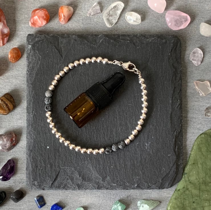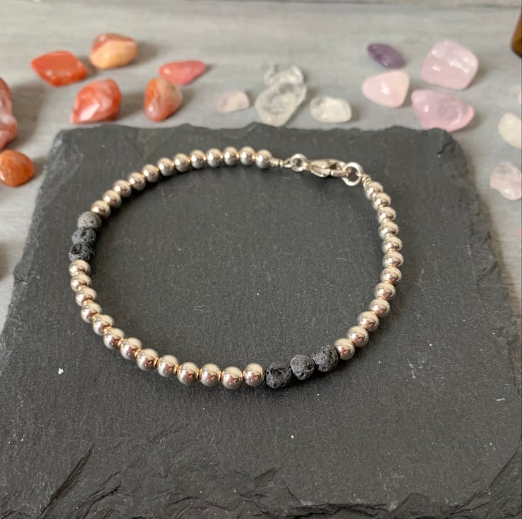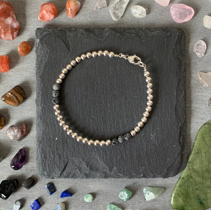 A Sterling Silver bead diffuser bracelet with natural unwaxed volcanic lava stones.