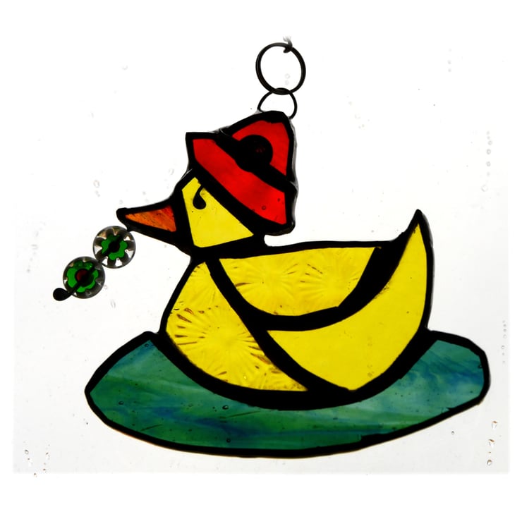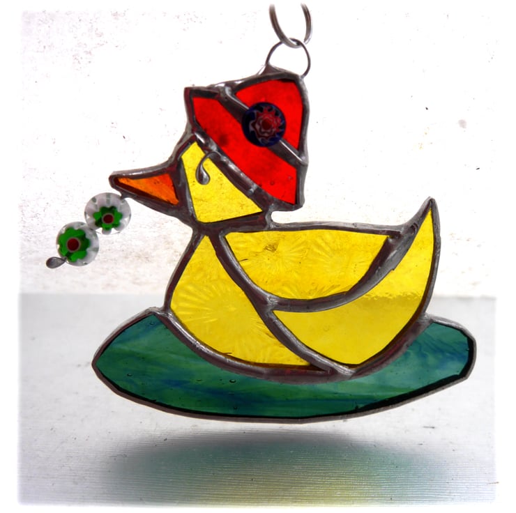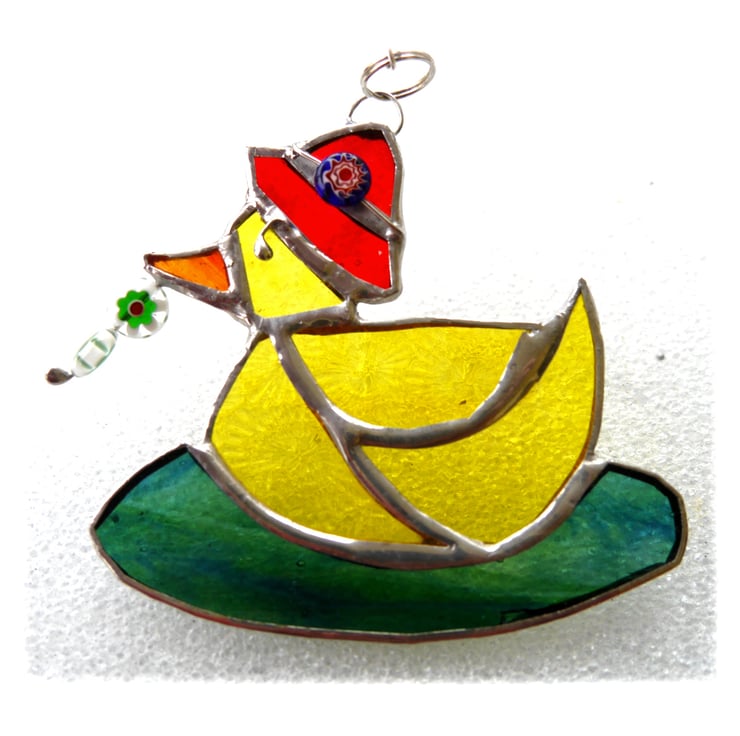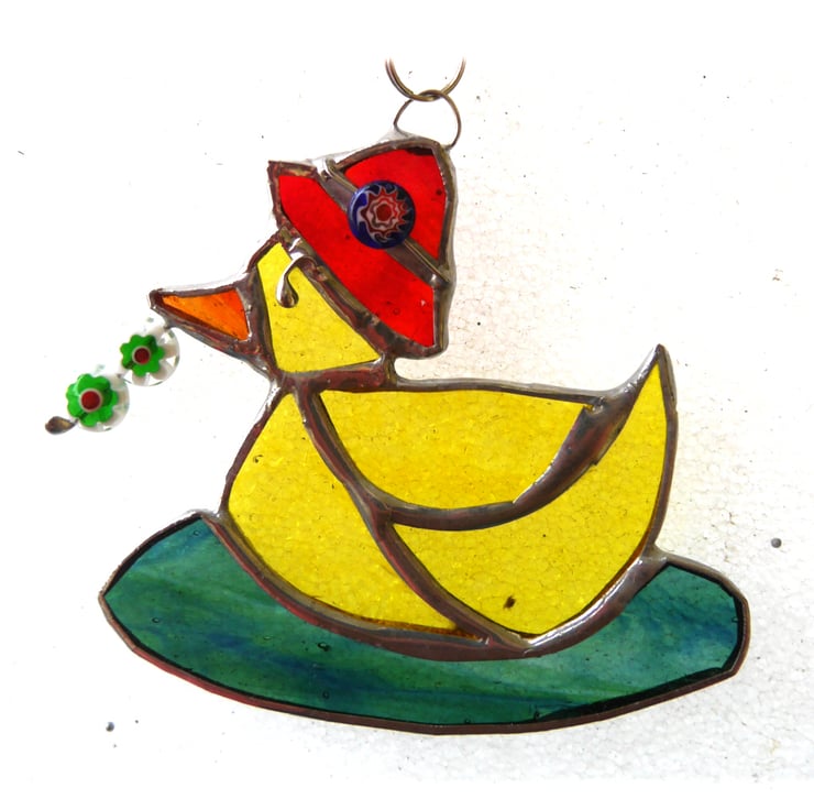 The suncatcher hangs by a little silver chain is securely attached to the duck’s hat. .