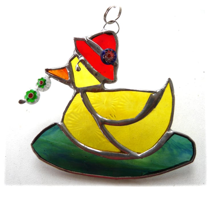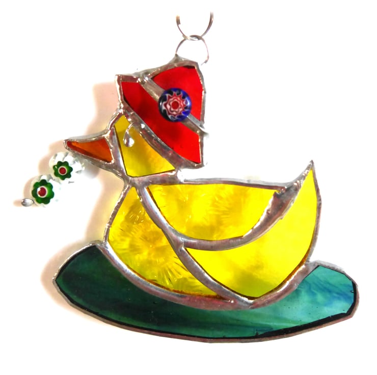 The little duck is swimming on a pond of bright greeny blue textured glass and sports a red hat with a flower bead decoration. It has a piece of green flowering weed, made from glass millefiori beads, in its beak.