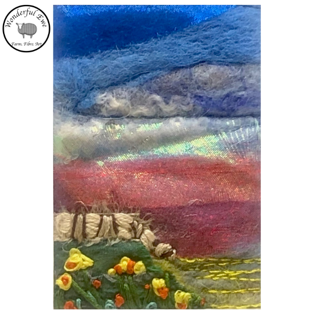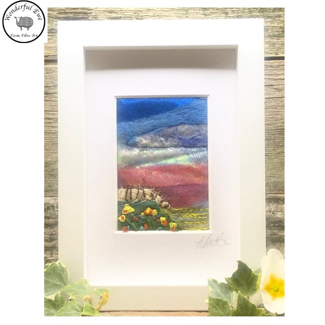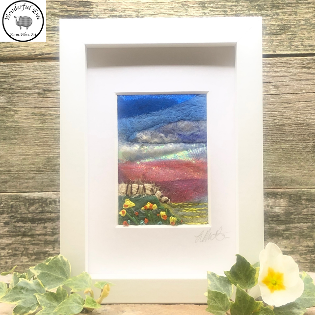 This small felt painting is full of texture and fibres. It has shades of purple and blue wool, shimmery chiffon and machine and hand embroidery.