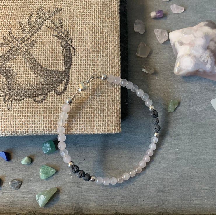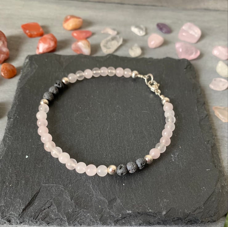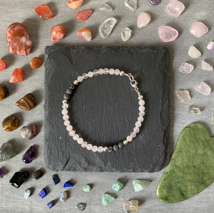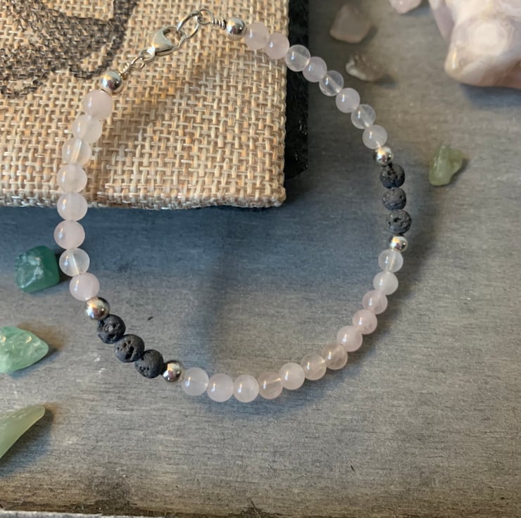 These 4mm Rose Quartz beads are pastel shades of pink, alongside 4mm Sterling Silver beads. The Volcanic Lava stones are unwaxed and porous, readily absorbing your choice of essential oils to ensure that your aromatherapy can be used over several hours. Useful during those stressful times, and pretty enough to wear anywhere and any occasion. Great for stacking alongside other bracelets too.