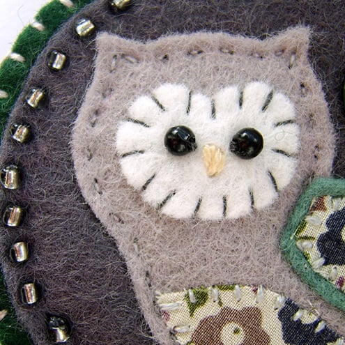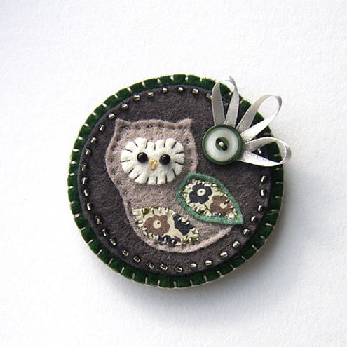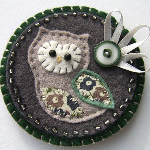 It features a little owl with appliqued wing and belly in Liberty fabric. It is mounted on to a circular felt base and is edged with pretty beads. It is finished with a button and ribbon detail and has a brooch backing for easy attachment.
