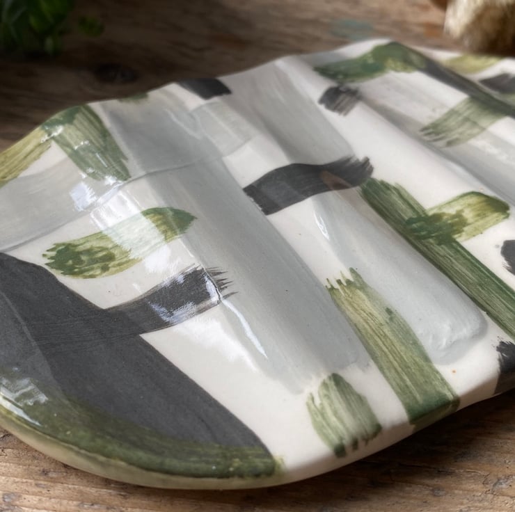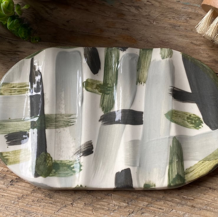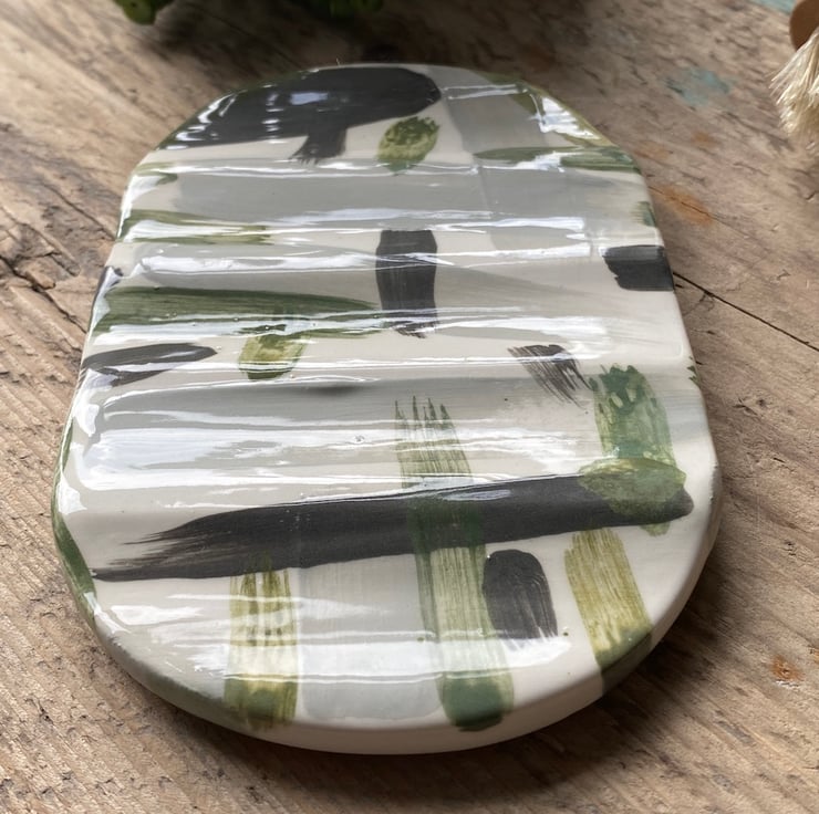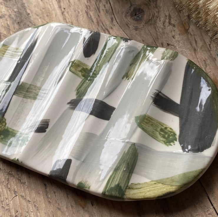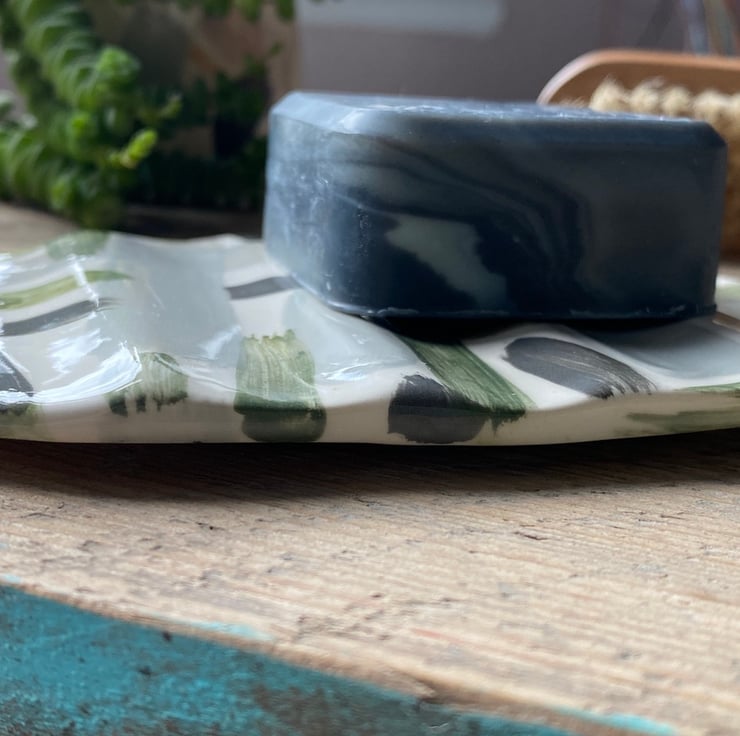This unique Soap Dish has been hand formed from Earthenware Clay before been decorated with a mixture of Ceramic Underglazes and Slips. This gorgeous colour way consists of soft Black, Greys, Greens and White.