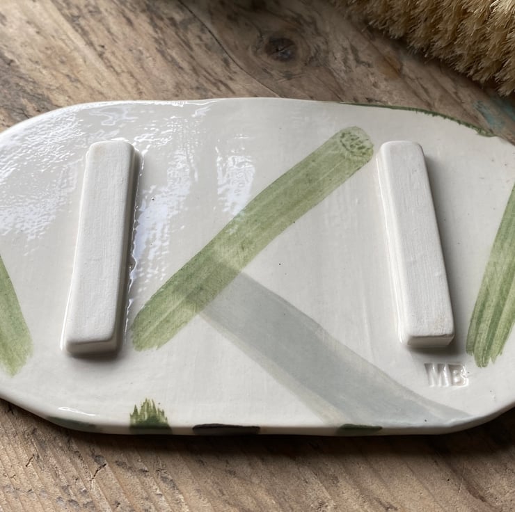 The back of the Soap Dish has been glazed , It is here you will find the MatildaBelle makers mark and two raised feet. The Soap Dish measures approximately 14cm x 9.5cm.