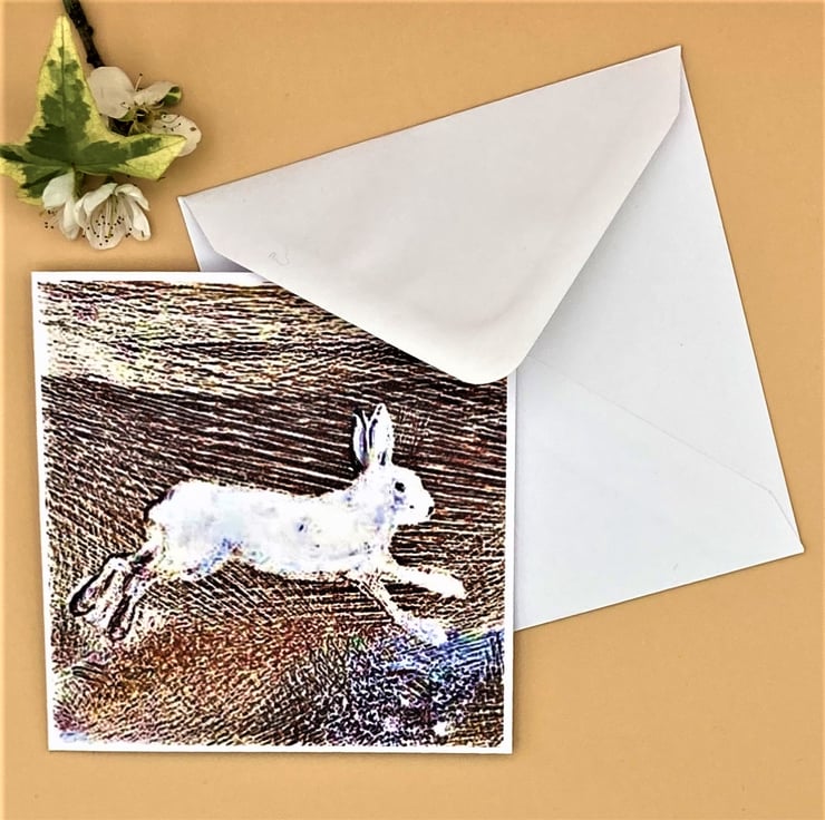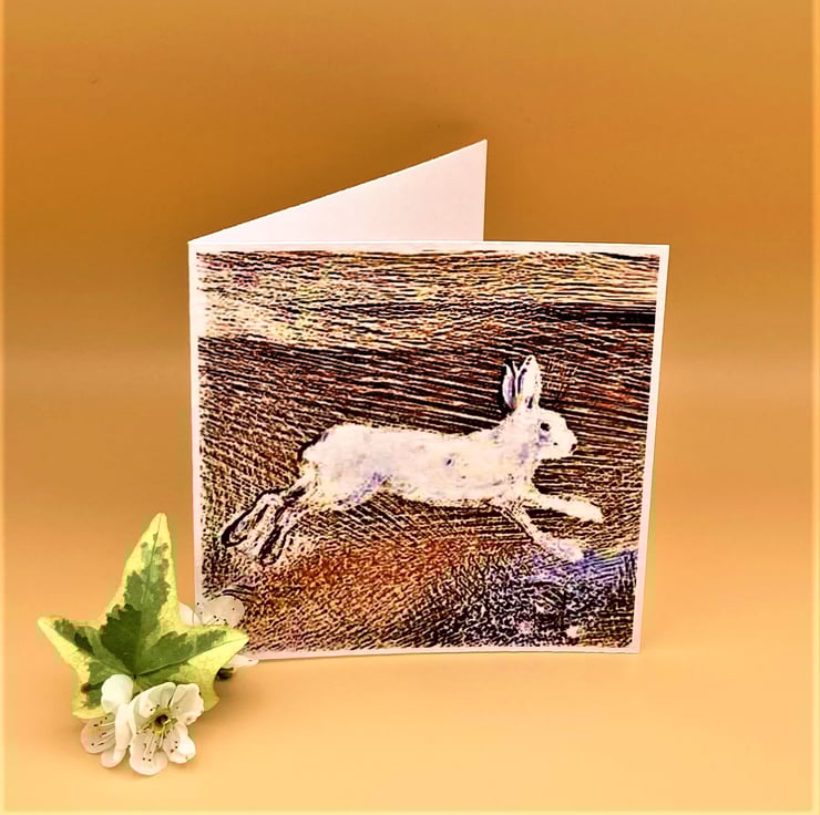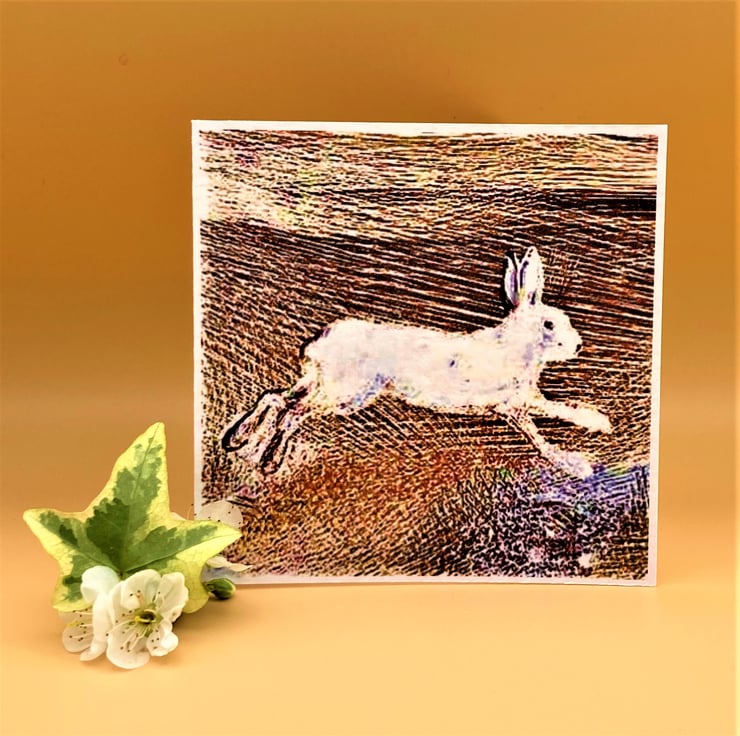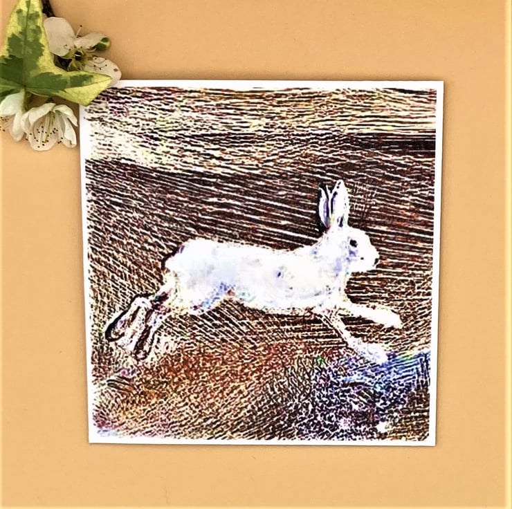 This little Easter card of a rabbit is a charming way to send a message this Easter. Taken from one of my digital paintings the card shows a rabbit running across a landscape. The colours are subtly muted and the card image gives the impression of a scored texture which makes the rabbit stand out against the background.