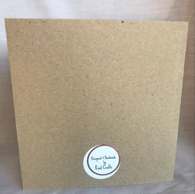 On the back of the card is a sticker saying handmade and designed by Kind Crafts.