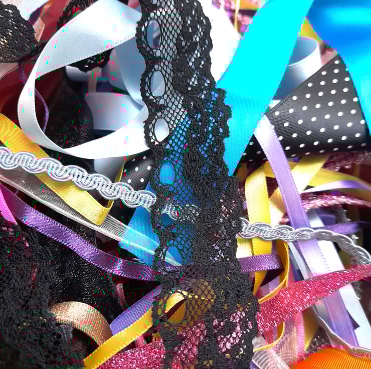 A lovely selection of lace, ribbon, and braid offcuts from end of rolls / projects. There are 30 pieces: 10 x 1 metre in length (minimum length), 10 x 50-100cm in length and 10 x 30-50cm in length - so approximately 20 metres in total. Also, a variety of widths - from very narrow to extra wide. Some ribbons are printed, others are plain.