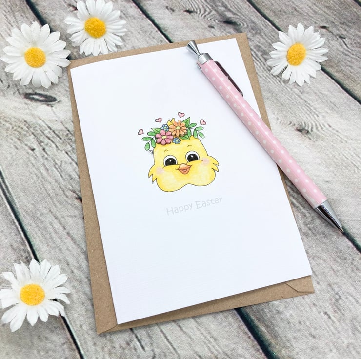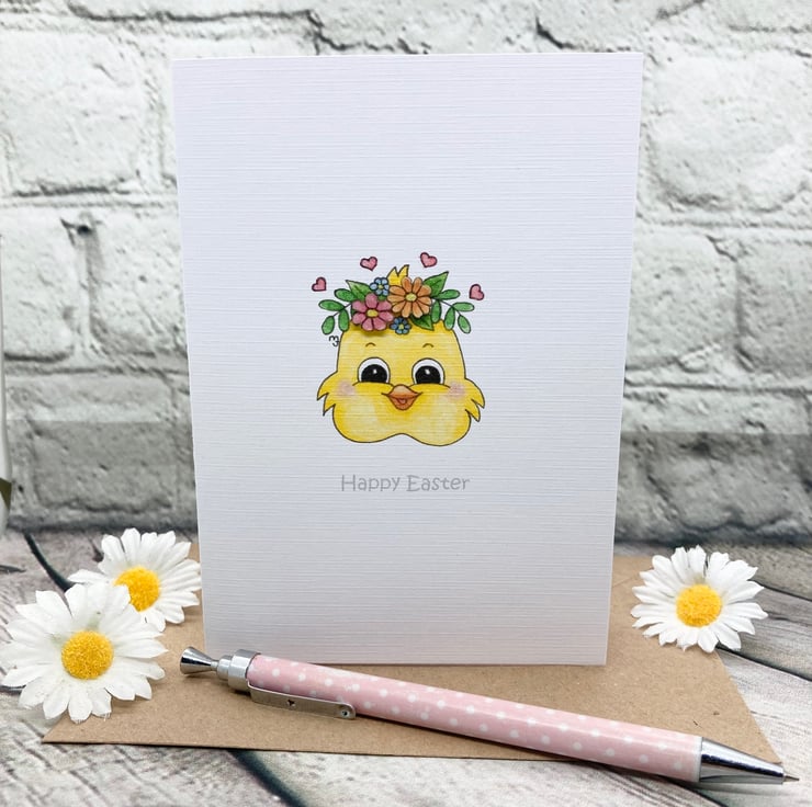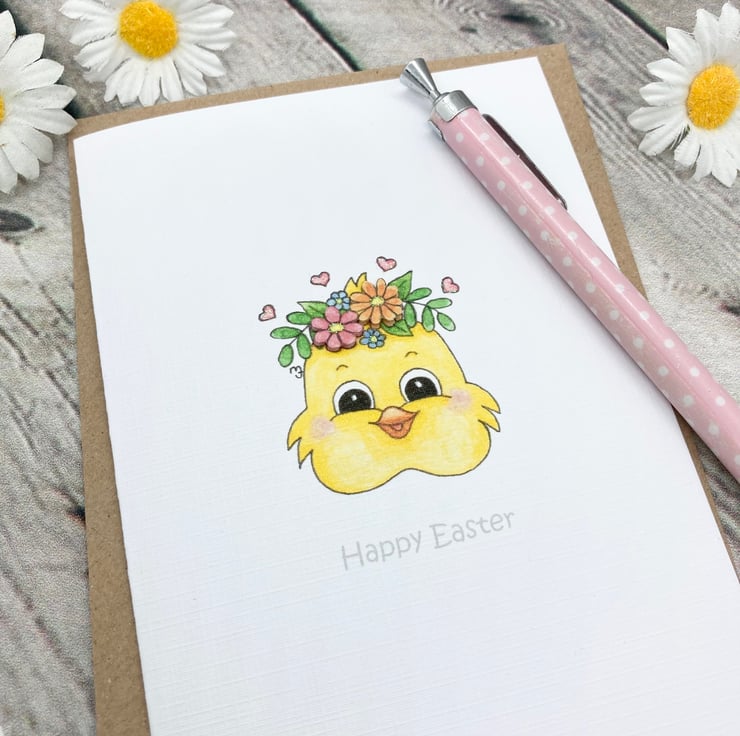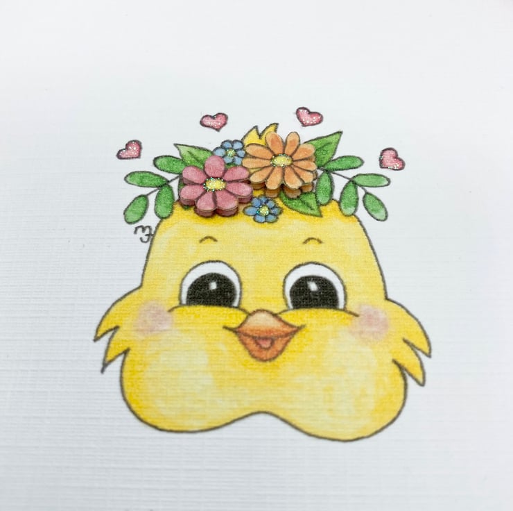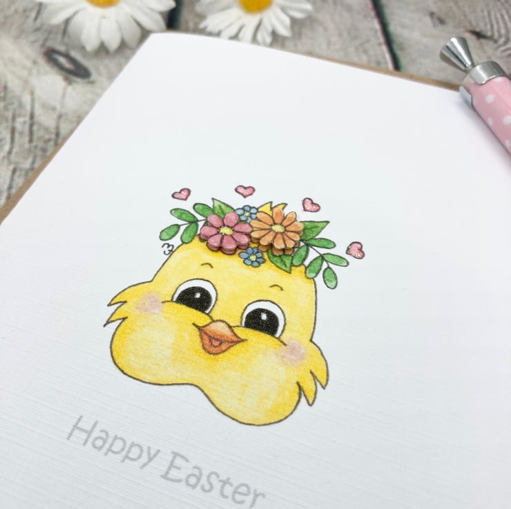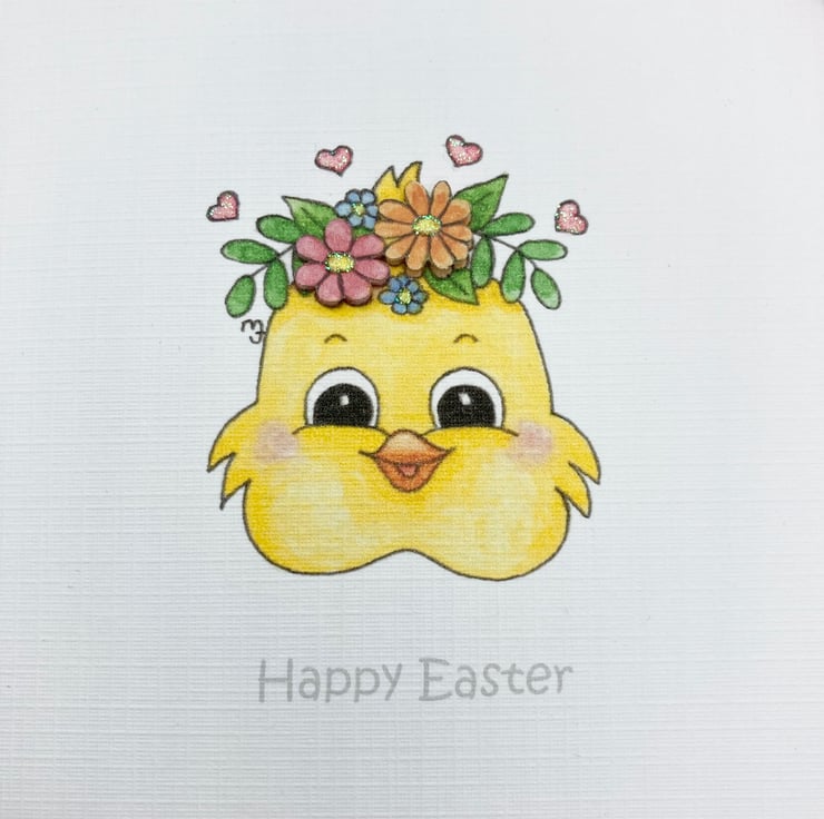 This cute Easter Chick card has been designed using my own original illustration. The image has been printed out onto good quality white linen embossed card and decoupaged up in parts. I have also added a little glitter detail.