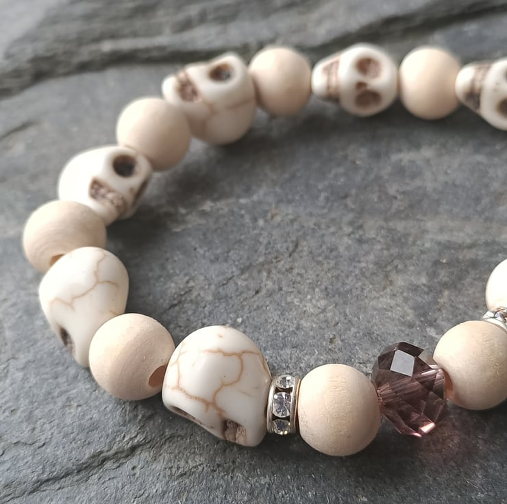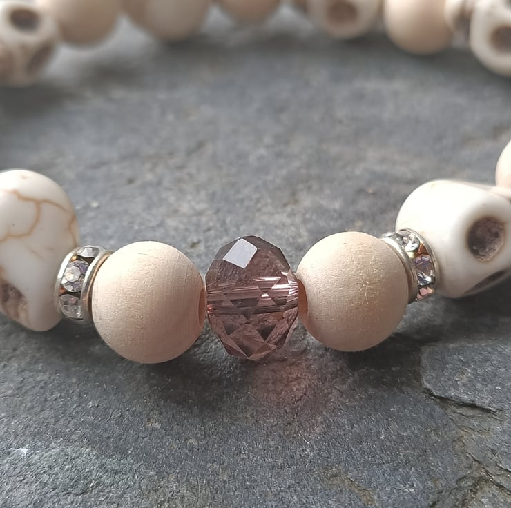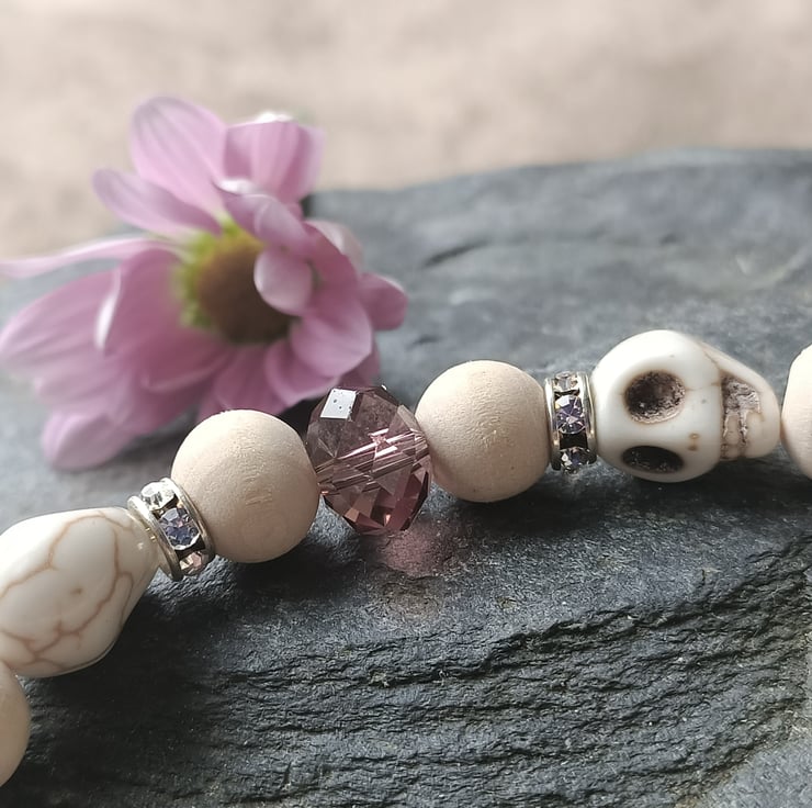 Skulls and rose, this beautiful bracelet has been made using 8 skull beads with 9 natural wood round beads. We have attached 2 diamante spacers and a beautiful rose pink centre bead.