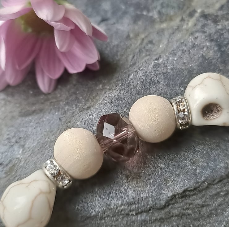 Beaded skull and rose pink coloured wooden stretch elastic bracelet.