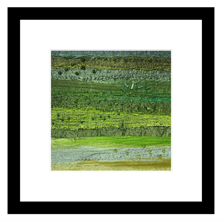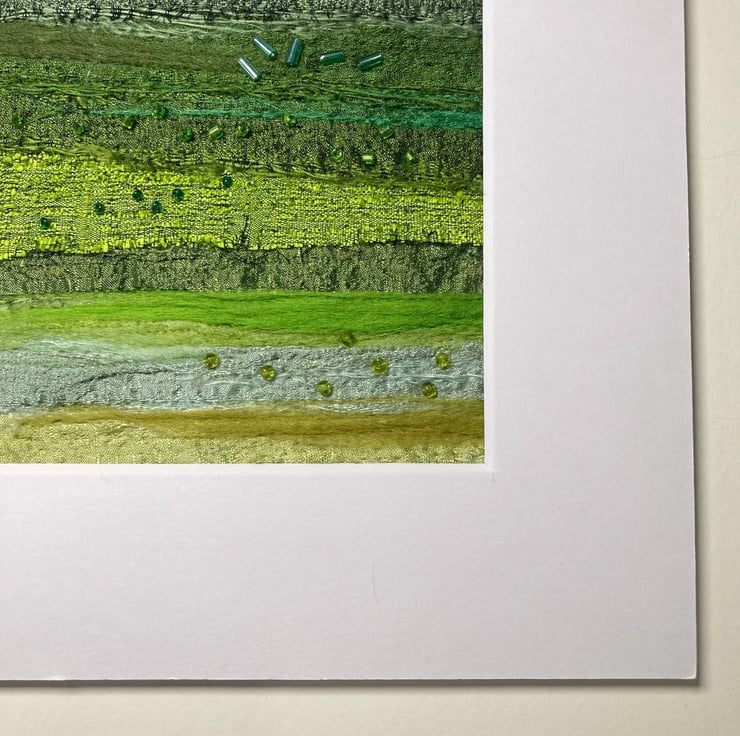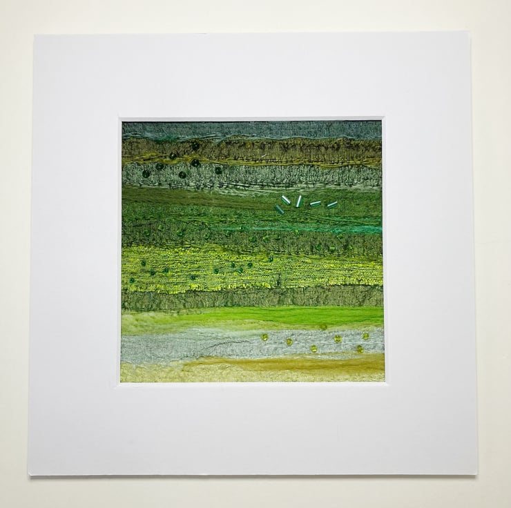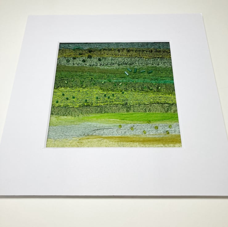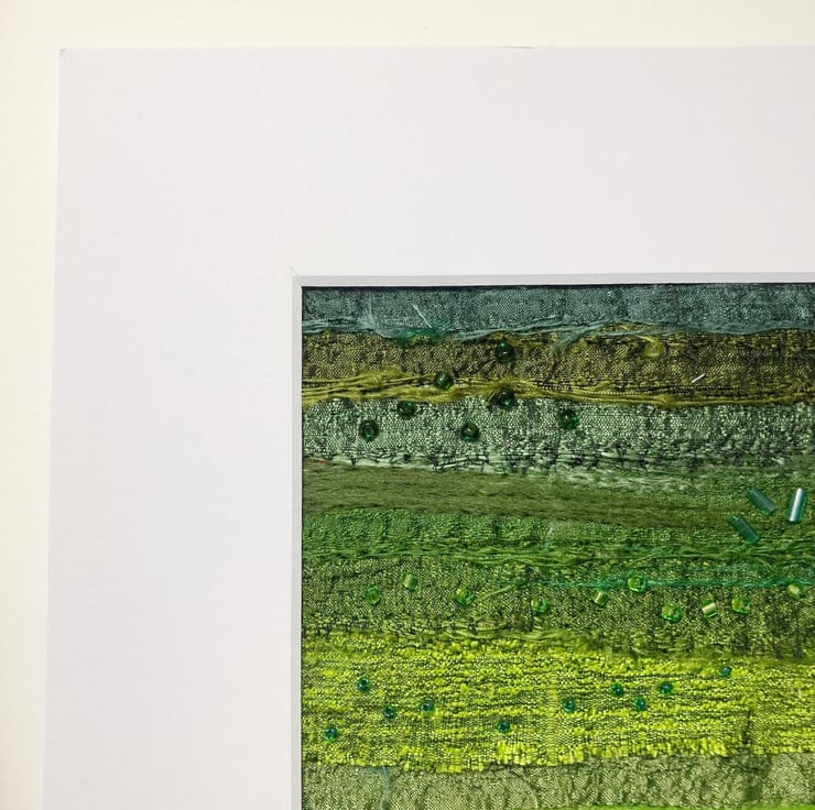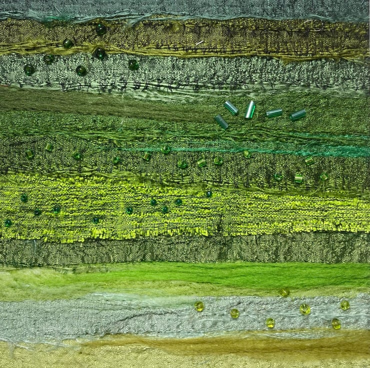 A green abstract textile art picture which is open to your own interpretations. The picture has been created using various shades of green silk fabric and wool and silk fibres with the addition of beading in selected areas. Strips of silk fabric have been needle felted onto a piece of backing felt with wool and silk fibres added in selected areas.The process of needle felting not only binds the fabric and fibres together but creates a fabulous texture to the silk fabric pieces. A variety of green beads have been hand sewn to enhance the picture.