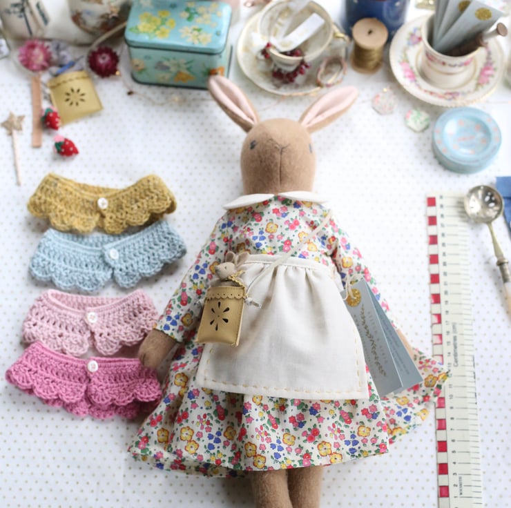 Her accessories include a tiny leather bag, hand punched with a daisy design and containing a baby bunny with a ric rac tie.