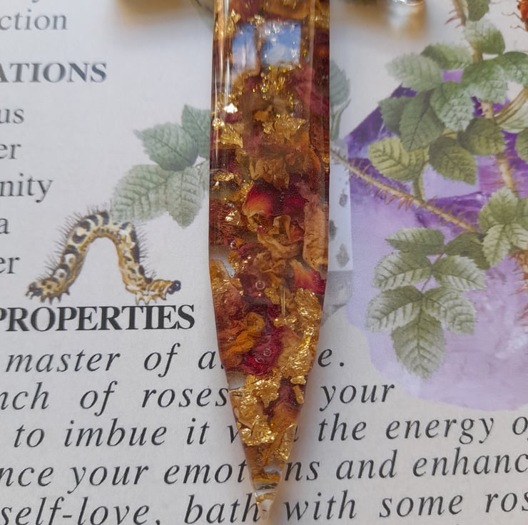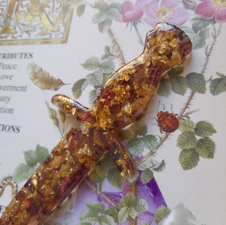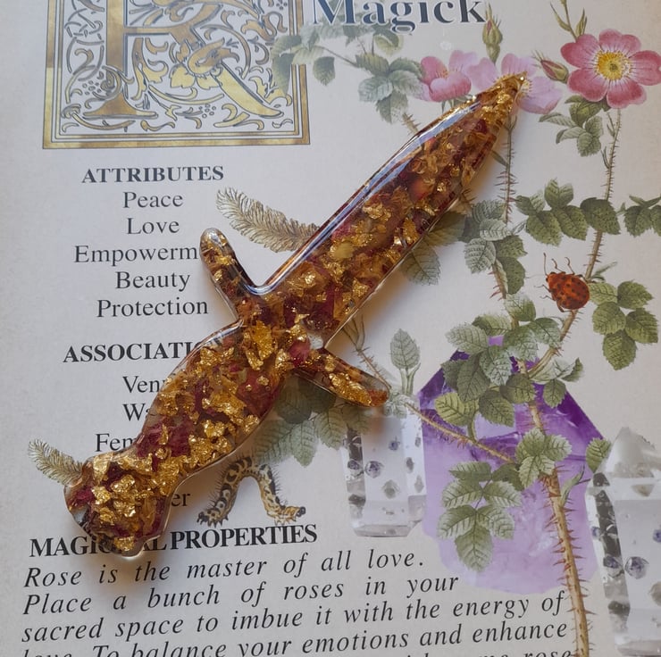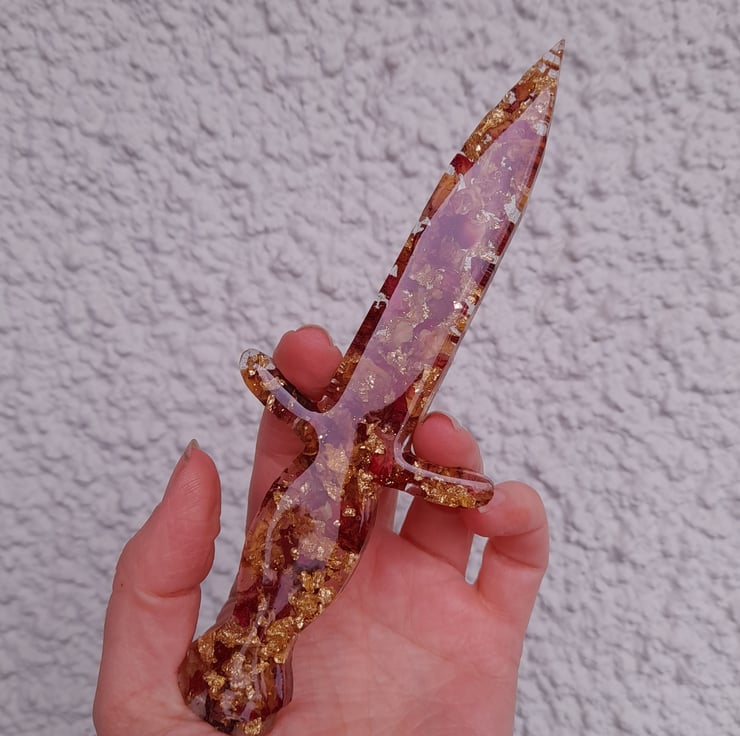This dagger has been hand crafted over a period of several days using multiple layers of three different types of resin. It has been made with love and filled full of rose petals and genuine 24ct gold leaf.