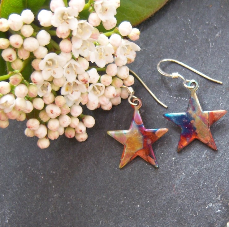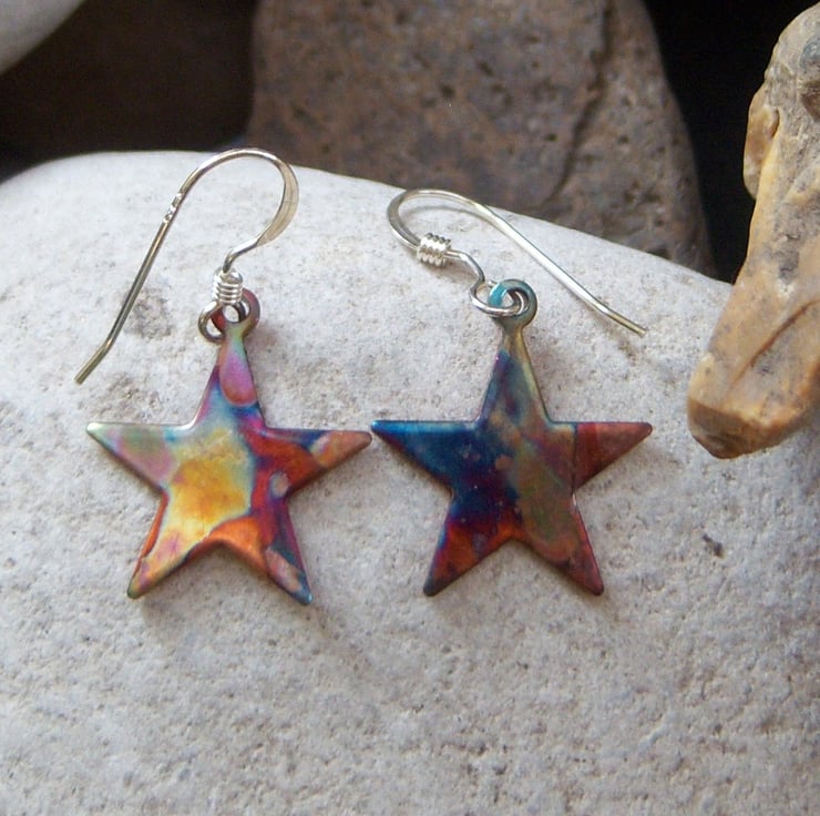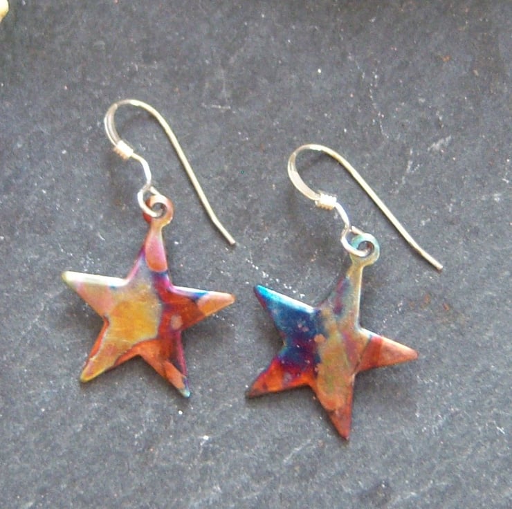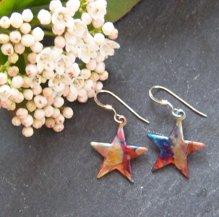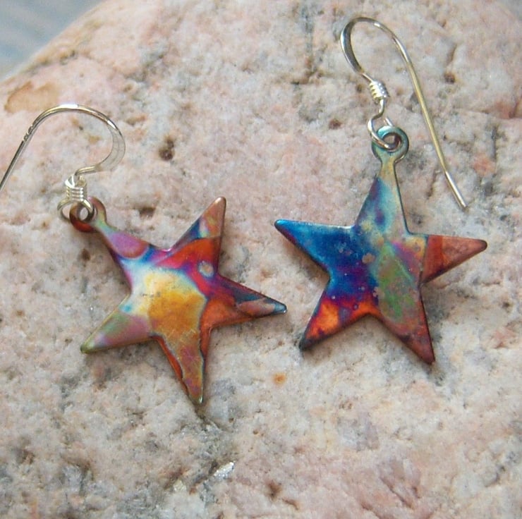 These copper star shaped earrings are approximately 1.6cms across. Sterling silver ear wires. They have been flame painted. This is a technique that produces a one-of-a-kind effect as you can see, the pattern will not be replicated. It is done with a micro torch, producing different hues of blue, green, pink, purple, brown, gold with each firing.