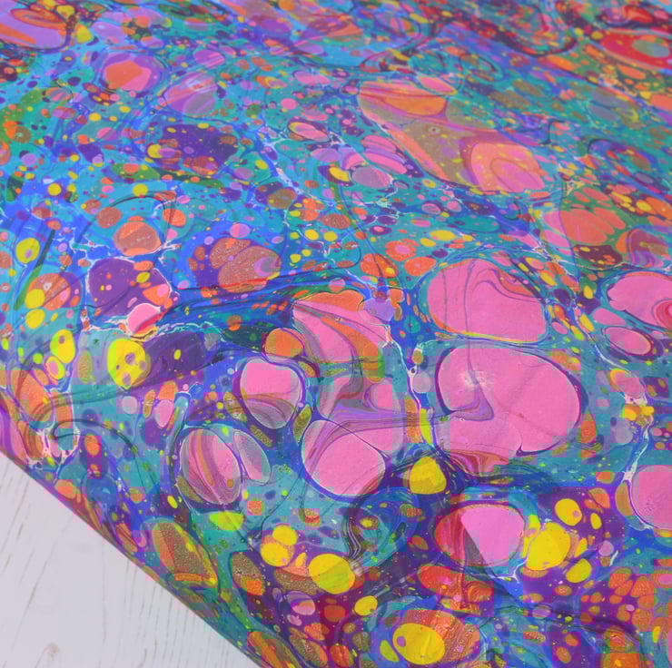 Every one of the sheets I sell are handmade by me from start to finish. there may be some very small blemishes in the pattern, this is part of the nature of hand marbled papers and are part of the charm. Most papers will also have a certain amount of paint on the reverse, this is unavoidable but does not affect the performance of the paper.