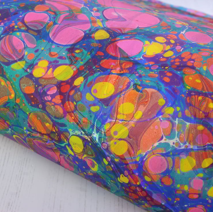 A gorgeously rich double marbled rainbow stone pattern. One short edge has a strip which has only been marbled once but it can just be trimmed away if desired.