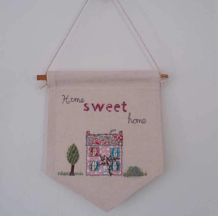 Cream canvas banner decorated with an appliqued house and garden and the wording 'Home sweet home'. The decorations include hand and free-motion machine embroidery. The reverse is a green and pink floral fabric so that the banner can also be hung at a window. Approximate size with dowel: 26 x 22cm, canvas size: 19 x 22cm.