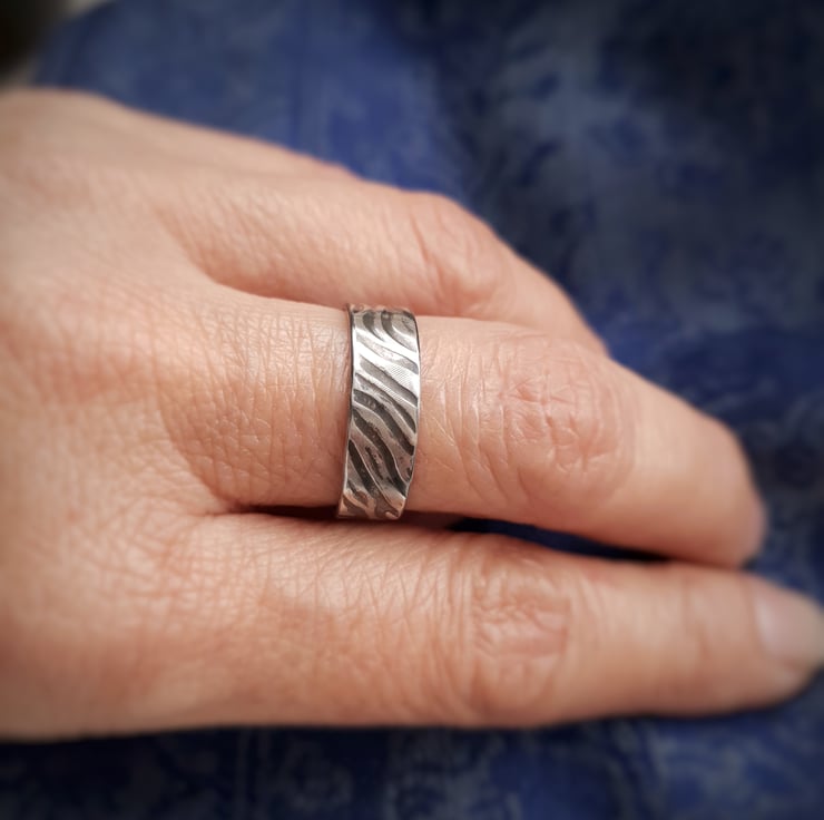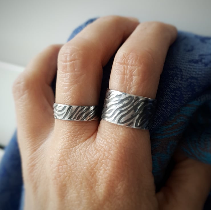 The bands are 12 and 6mm wide, 1mm thick, and come in sizes from O to S. When ordering please indicate which band you wish to buy (wide or medium) and the size you require. The bands are very comfortable to wear as they offer flexibility when bending your fingers or when your finger size changes.