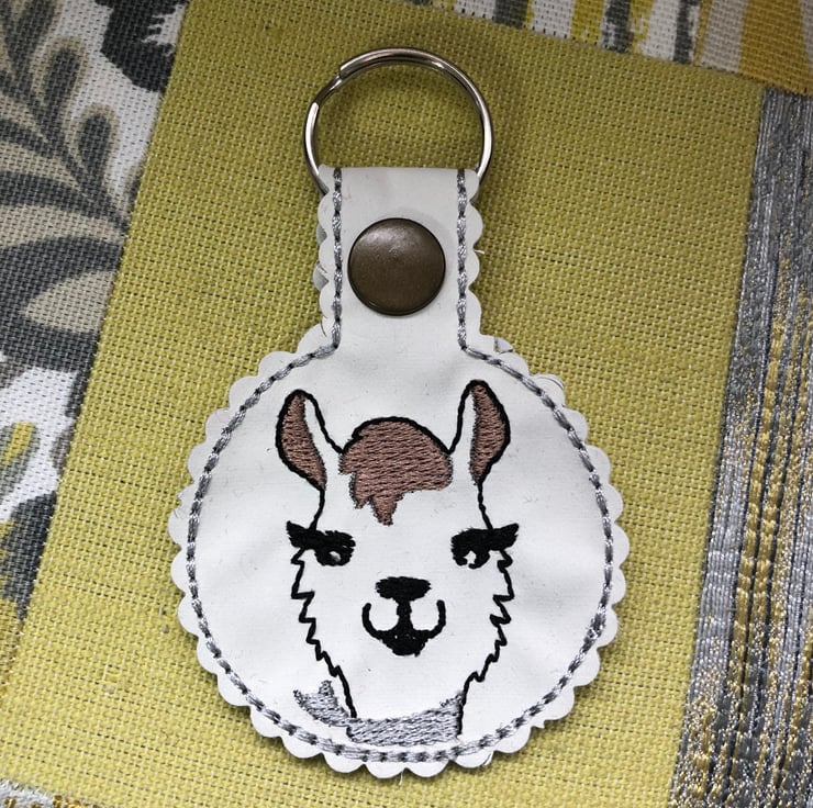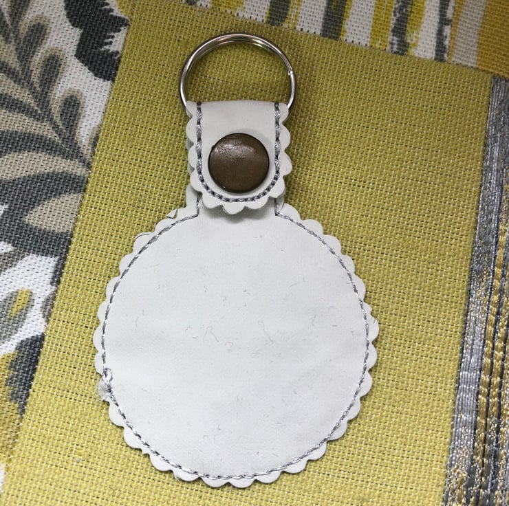 Machine embroidered onto faux leather with a vinyl back and finished with kam snap fastener and metal ring.