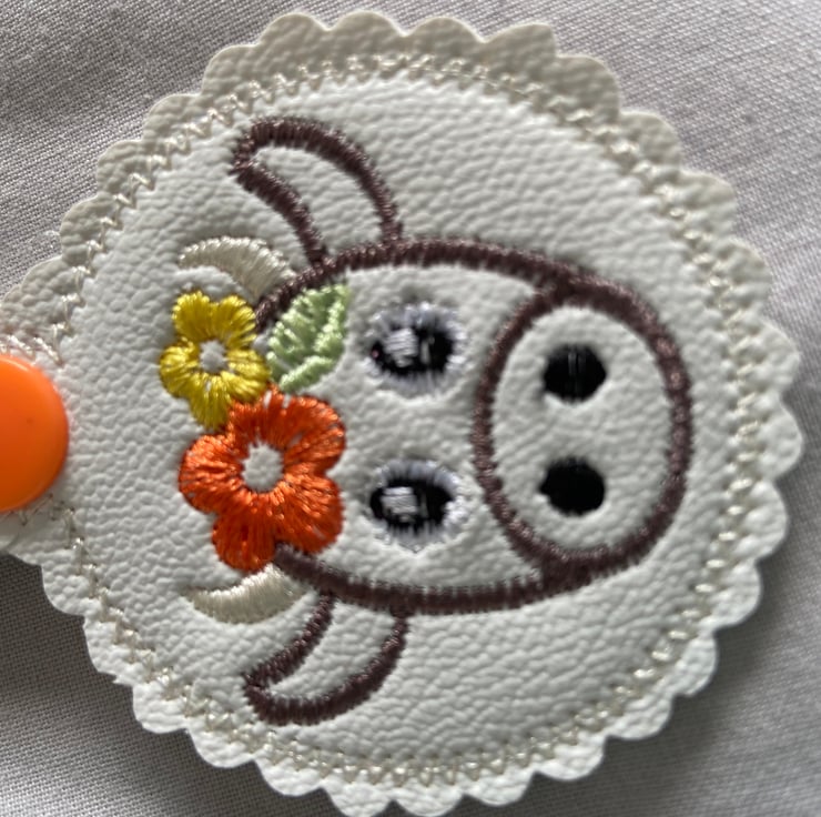 Machine embroidered onto faux leather with a plain vinyl back.