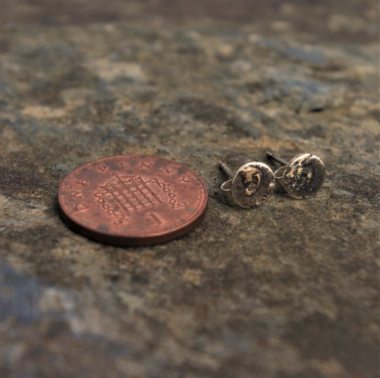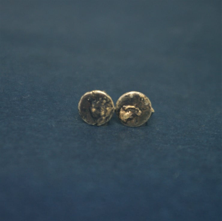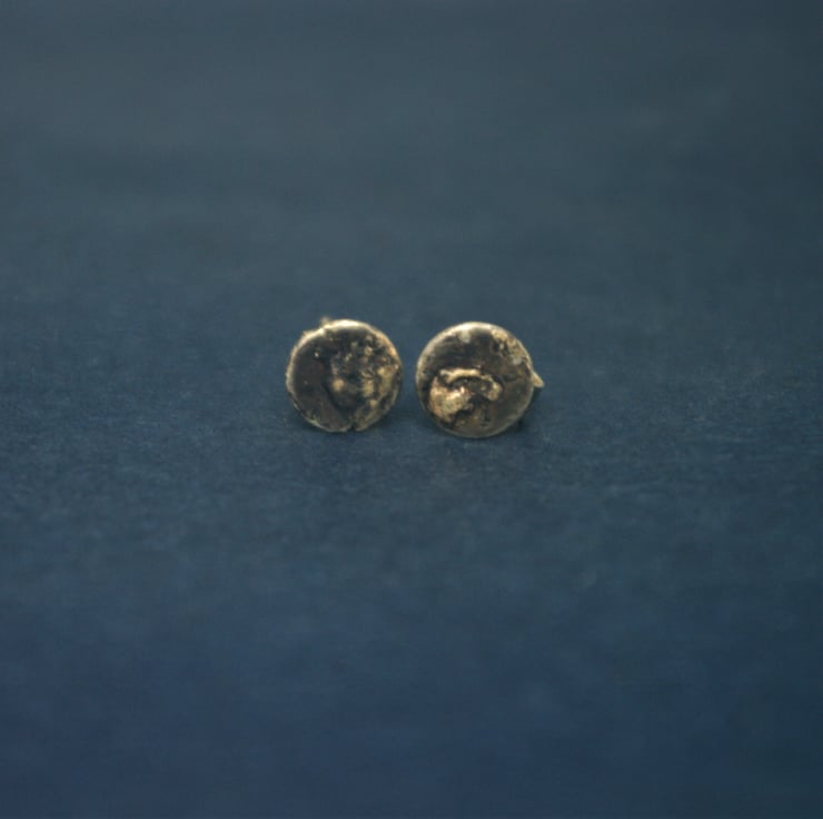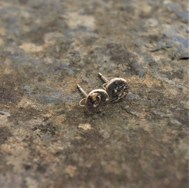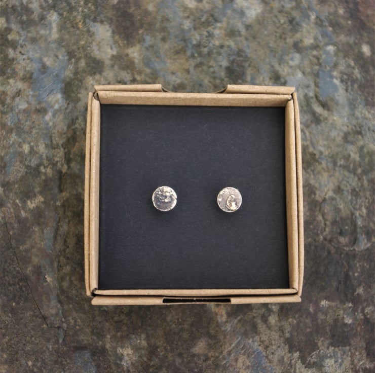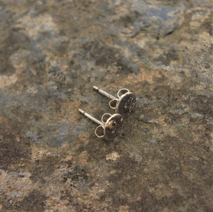 Small round silver discs with textured speckles of recycled gold . The silver is eco sourced and has been oxidised to black/ grey which makes a great contrast with the highlighted gold and silver speckles.