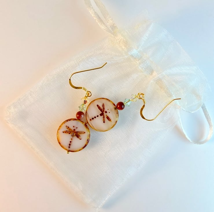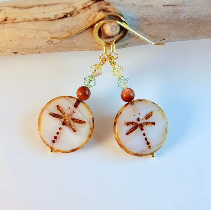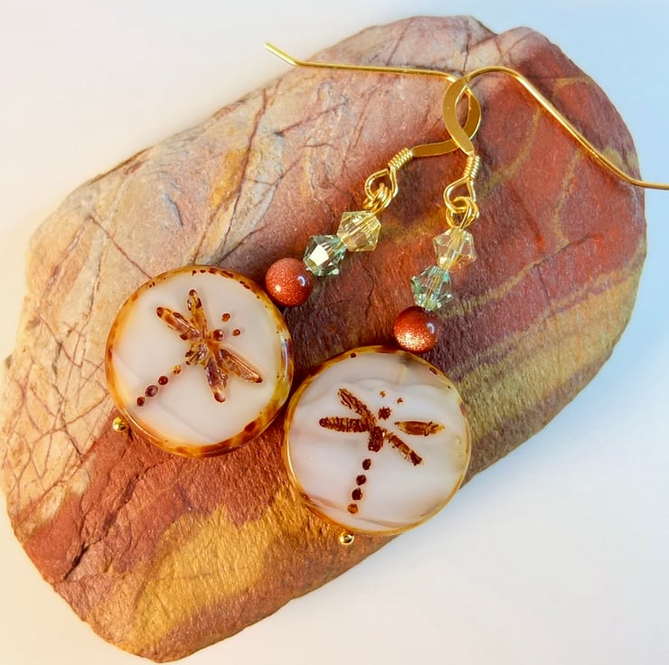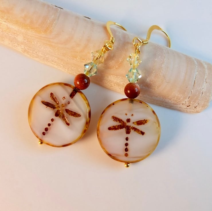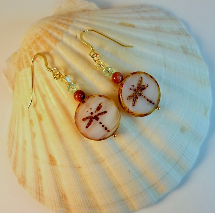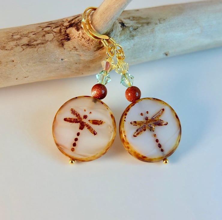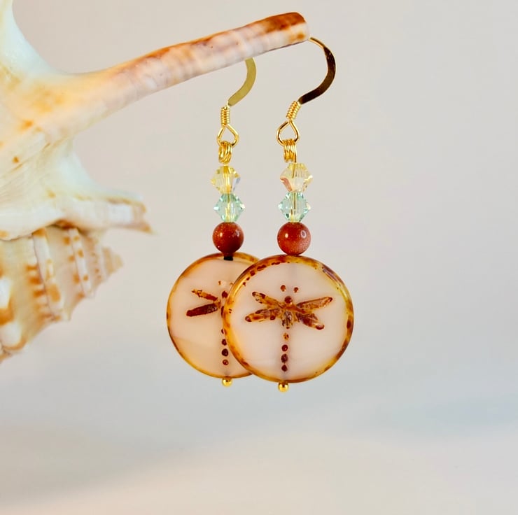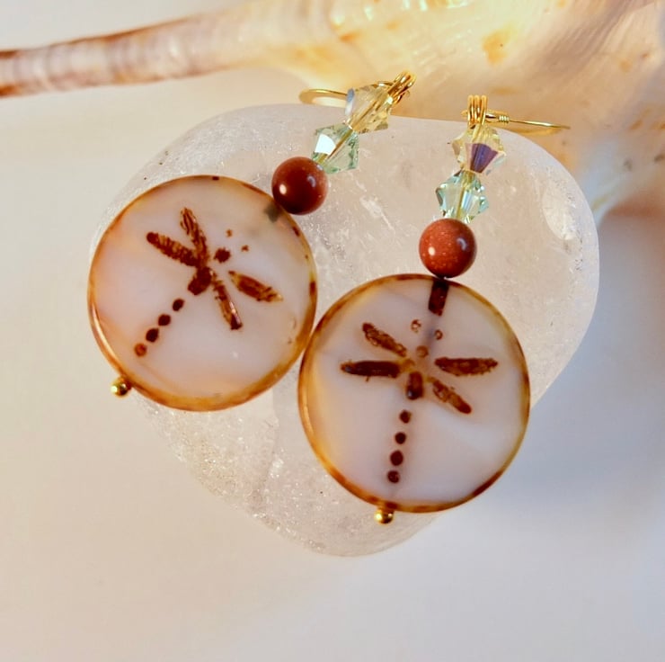 These Czech glass coin beads measure approximately 17mm and feature a dragonfly silhouette on both sides.