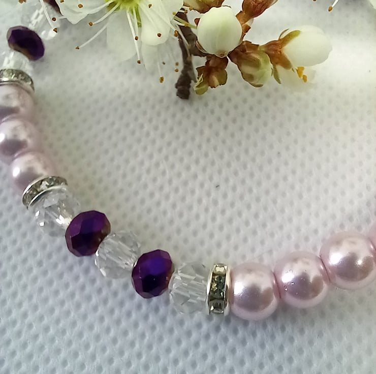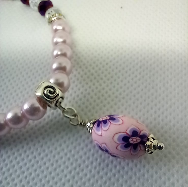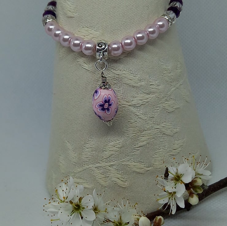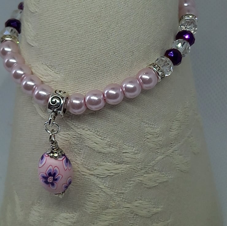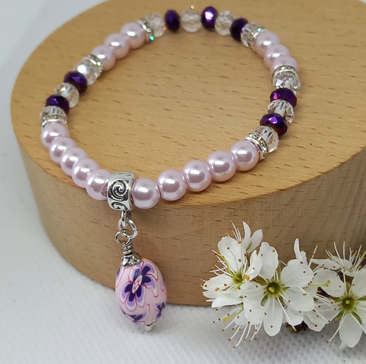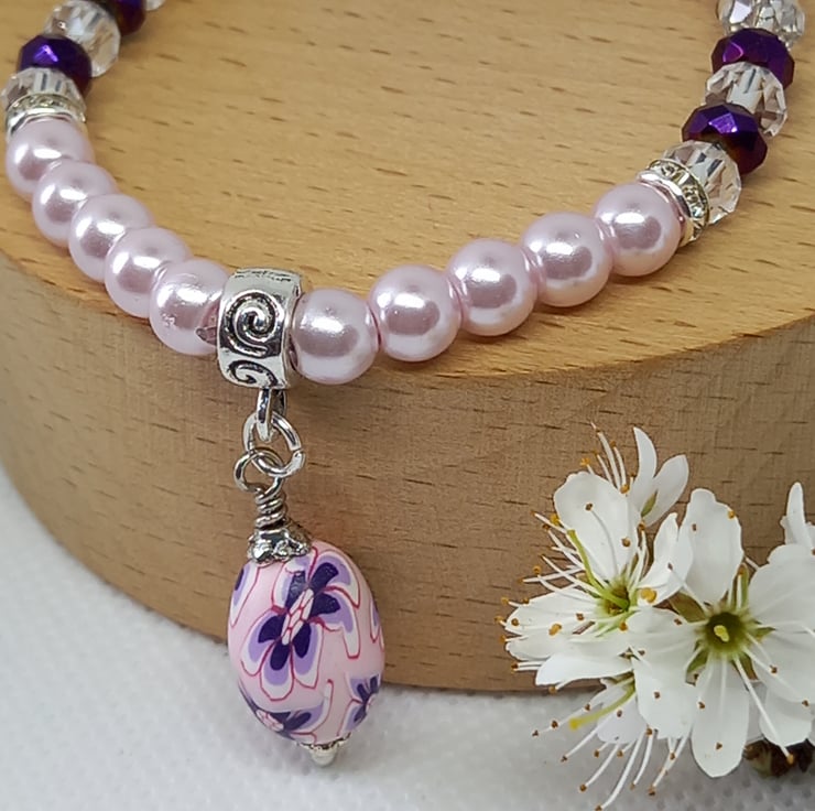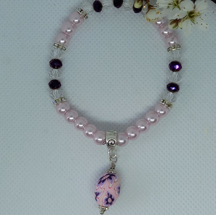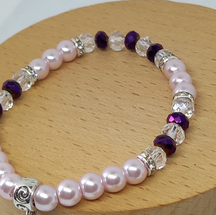 Delicate pink glass pearls are combined here with accents of purple using crystal rondelles and clear rondelles, plus extra sparkle from diamante spacers. Completing the picture is an oval polymer clay bead made into a charm with bead caps, suspended from a swirl pattern charm carrier. The pearls and rondelles are threaded onto strong jewellers elastic and the bracelet has an internal measurement of 6.5 inches.