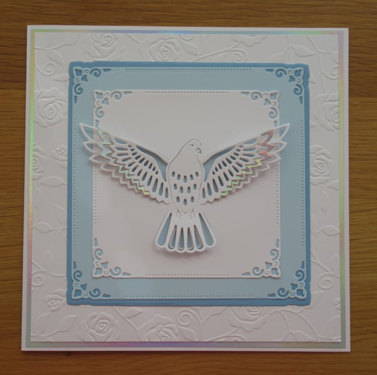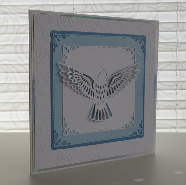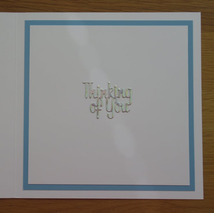 This card features a large multi layered die cut dove in shades of blue and white. The wings and tail are only fixed in the centre so can be raised for added dimension and the white background card has been embossed by me with a rose pattern. The inside has been finished to coordinate with a thinking of you greeting