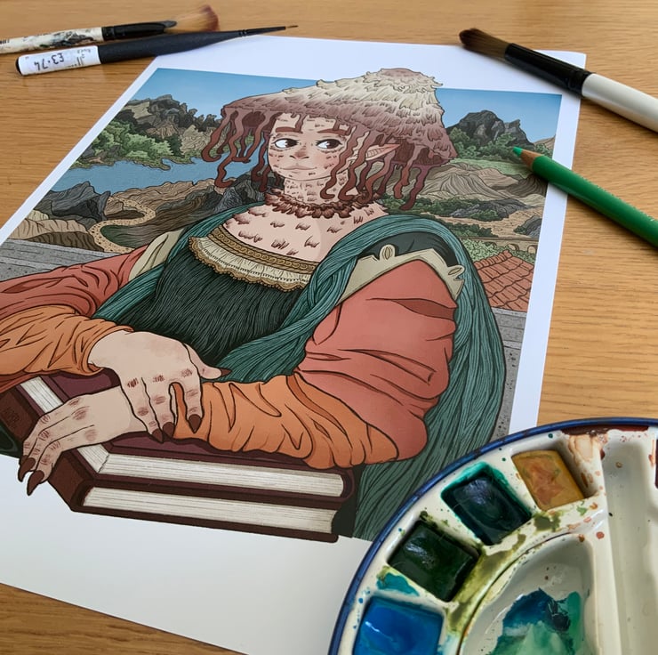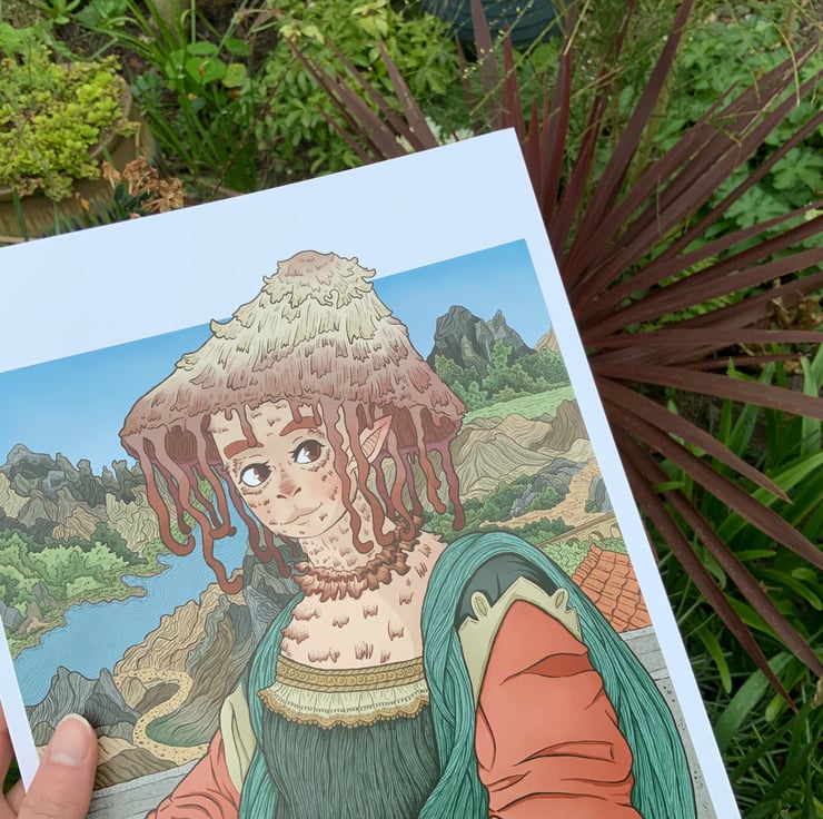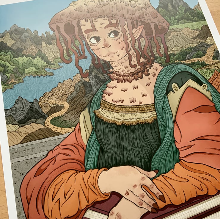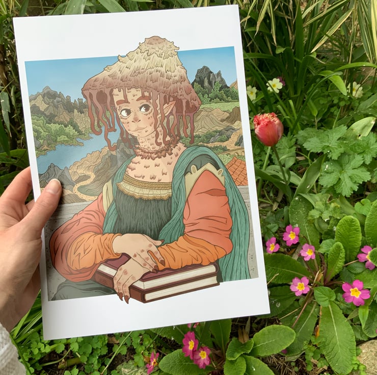 Fun portrait inspired by the iconic Mona Lisa by Leonardo Da Vinci. Adding in a couple of details of my own from adding back in mona’s eyebrows and putting my own mushroom themed spin on the piece.