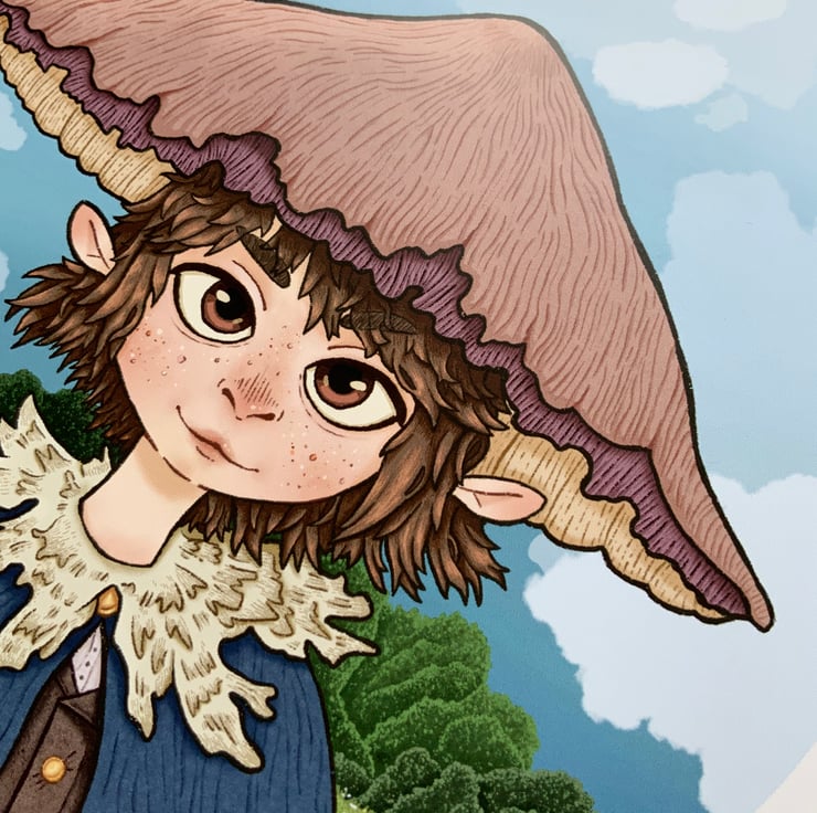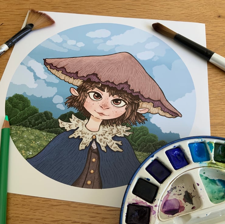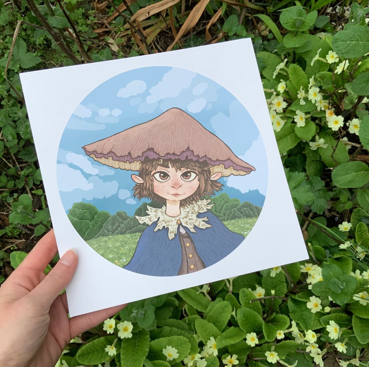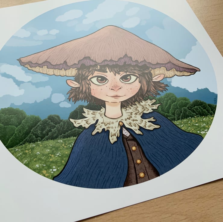 Sweet fantasy portrait of a mushroom friend surrounded by a lush meadow. This print is great for adding a fantastical feel to a space.