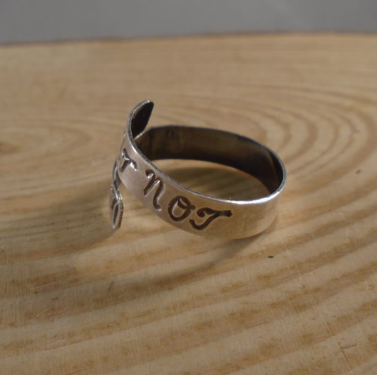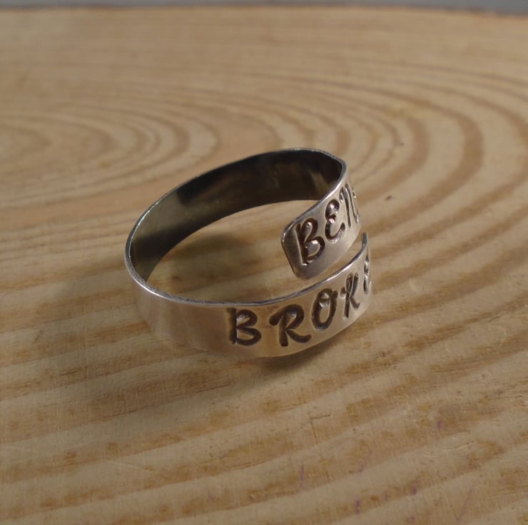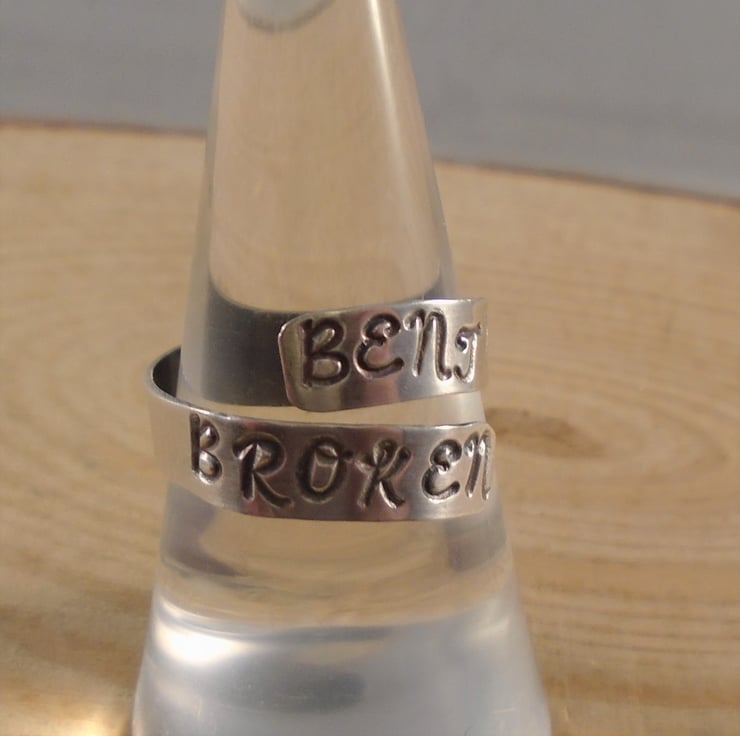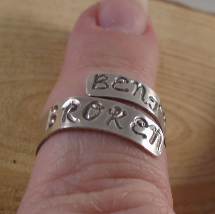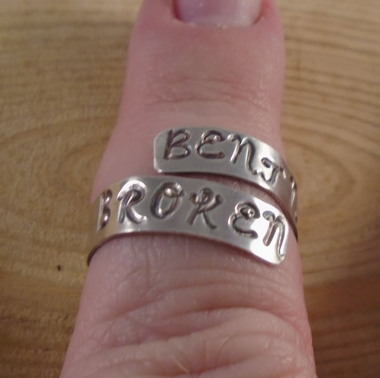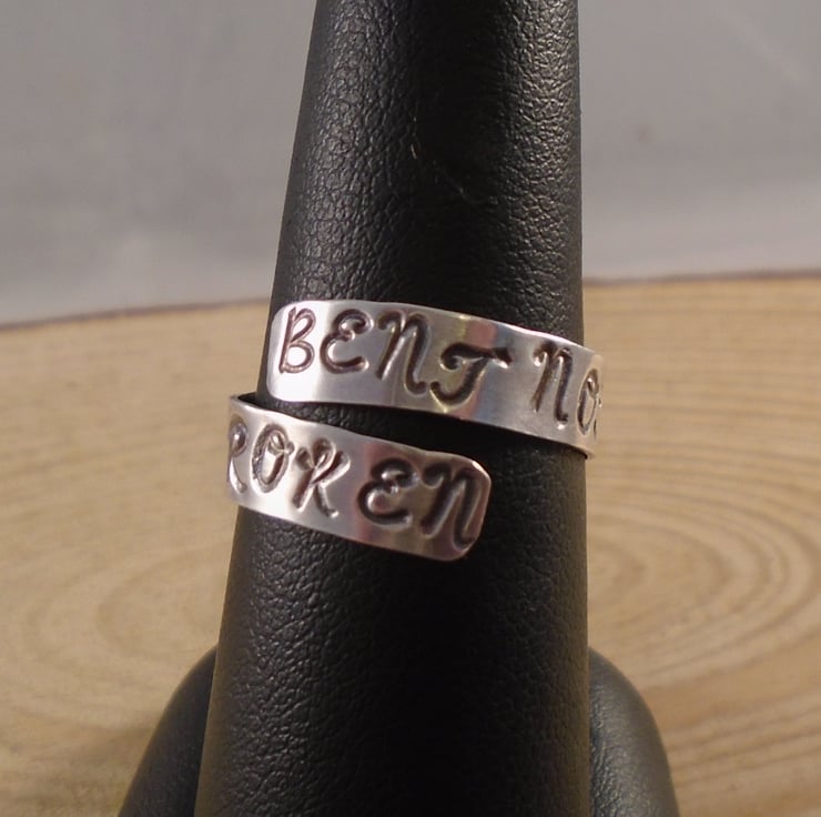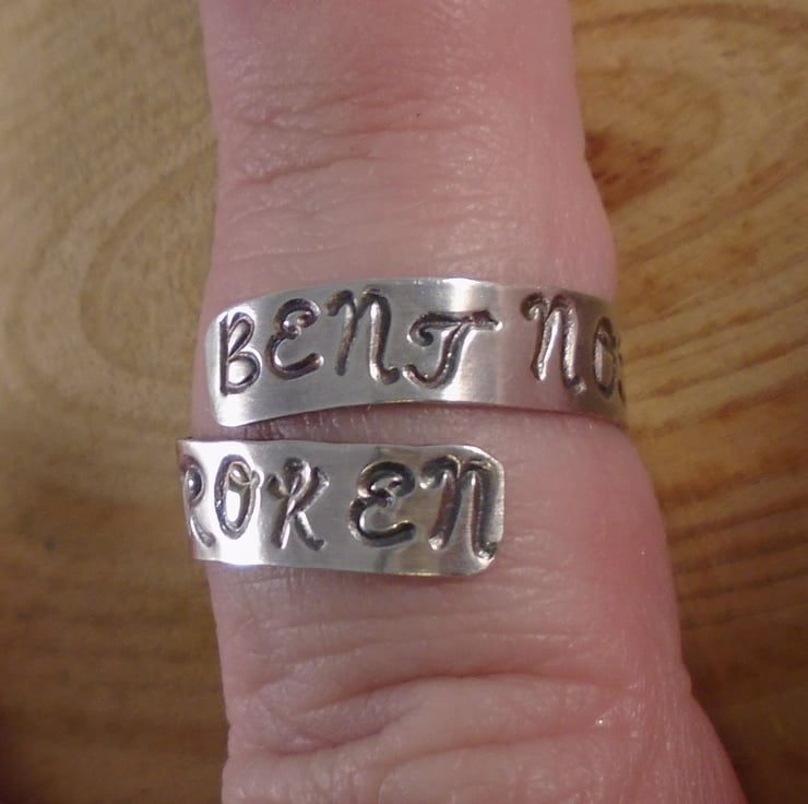 A simple yet inspirational ring, hand made from sterling silver. A strip of silver has been hand pierced from a sheet. It has then been hand stamped on either end with the words 'Bent Not Broken' and bent around a mandrel to form an adjustable ring. The ring has then been oxidised to blacken the writing.