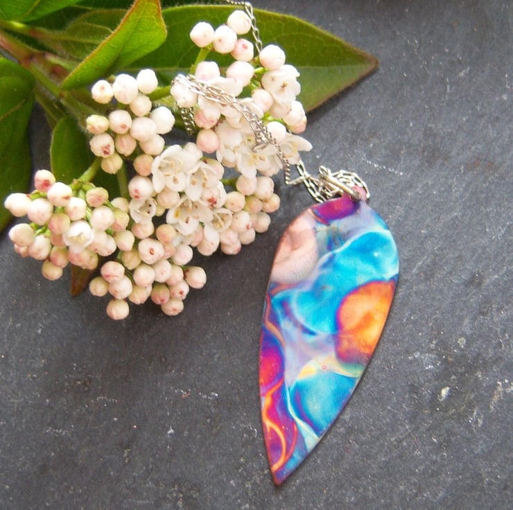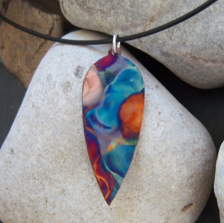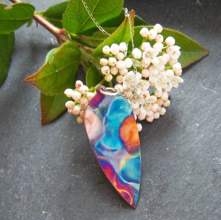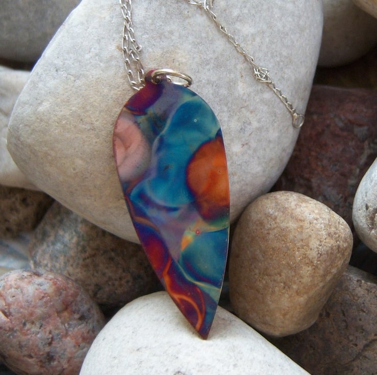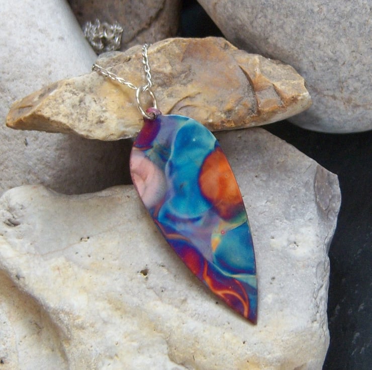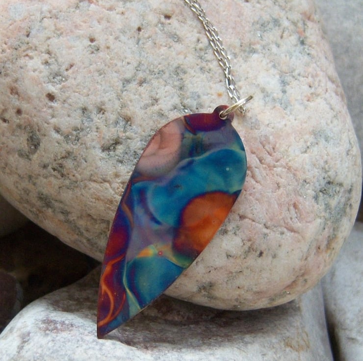 A copper leaf shape that been been flame painted. This is a technique that produces a one-of-a-kind effect as you can see, the pattern will not be replicated. It is done with a micro torch, producing different hues of blue, green, pink, purple, brown, gold with each firing.