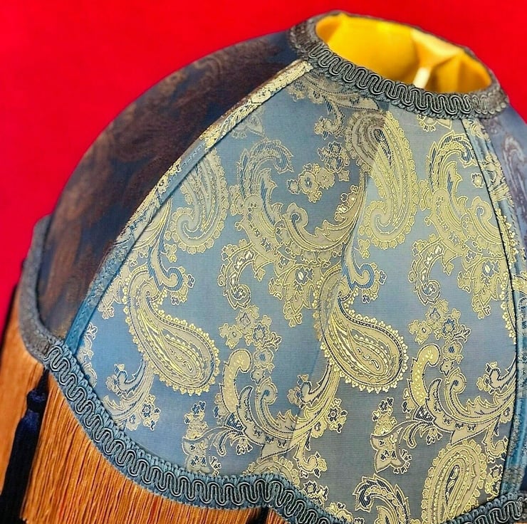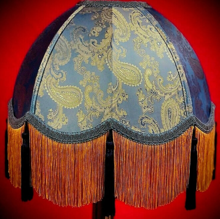 A stunning traditional dome lampshade bespoke handmade in our aqua blue Paisley fabric which has a 2-tone shimmer effect. These lampshades are complimented with our slate blue braid, antique gold fringe and navy blue tassels hanging from each scallop. These lamp shades are fully lined on the inside in our inner lining fabric and are available in 3 different sizes (Please see dimensions below). The dimension shown in the drop down menu is the diameter across the bottom of the lampshades.