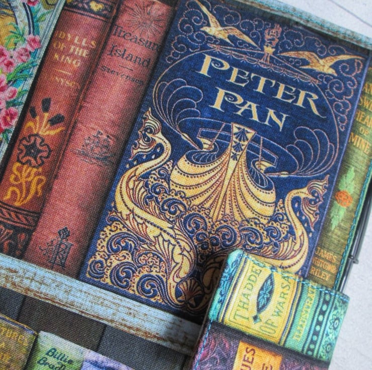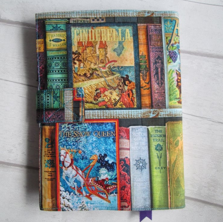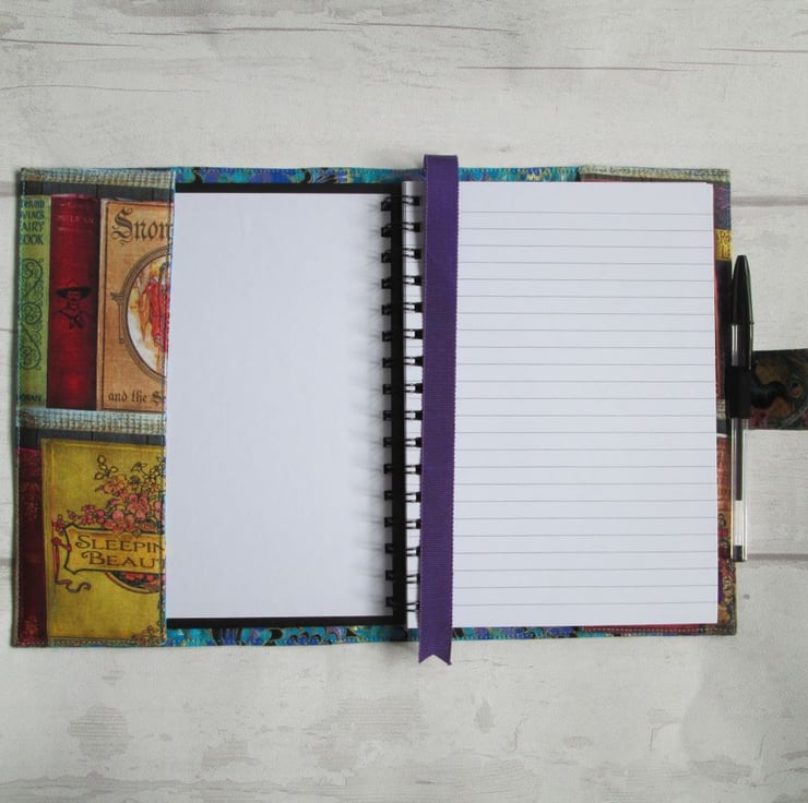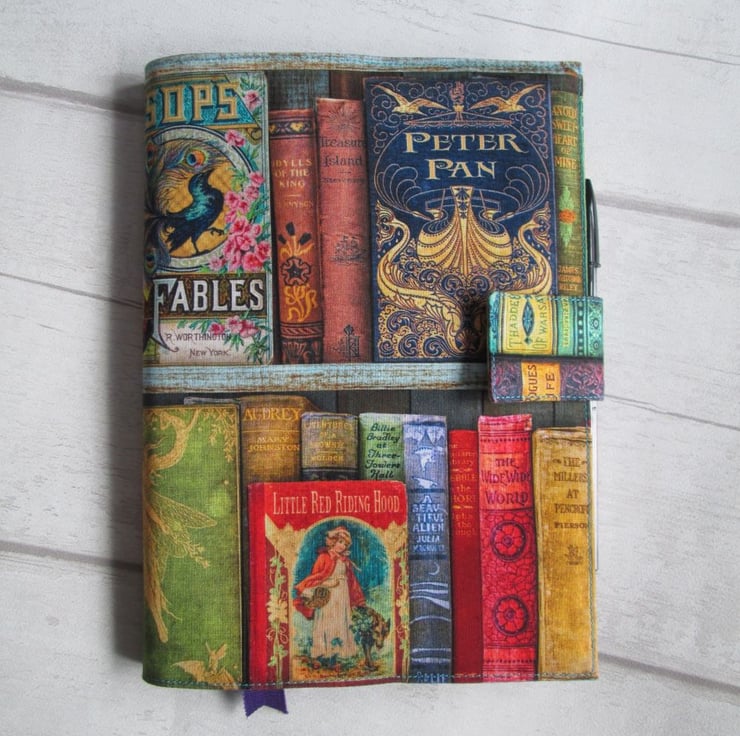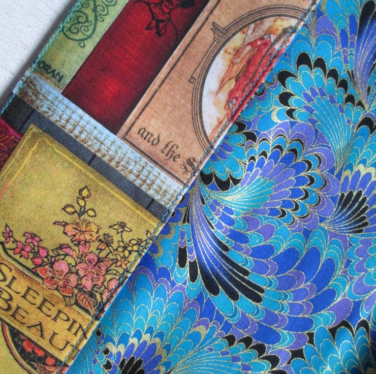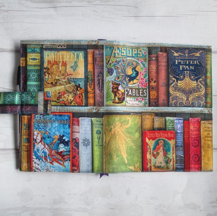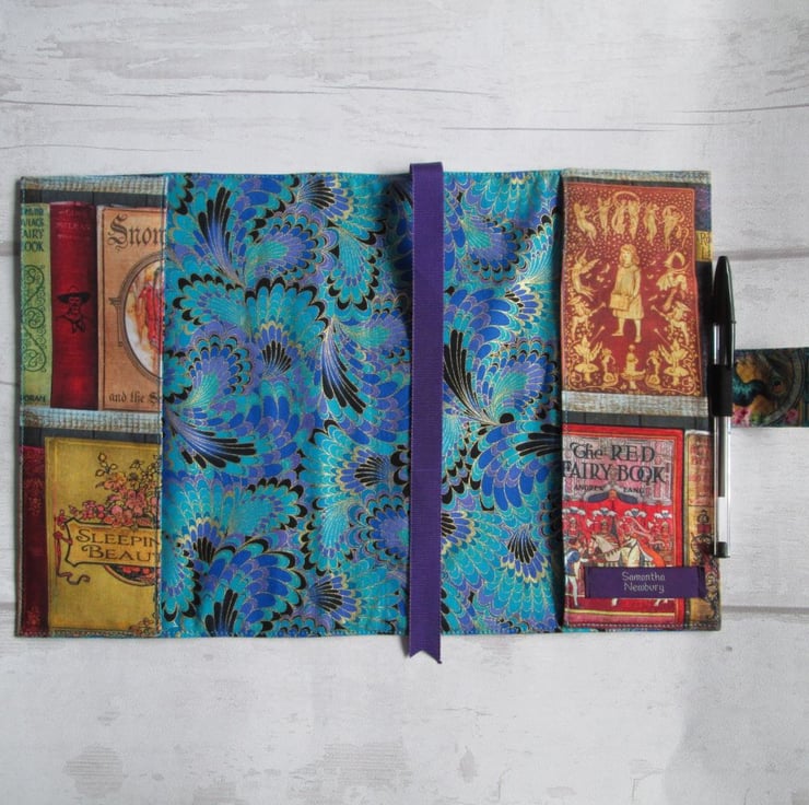 The lovely thing about this fabric is that each cut gives you a different selection of children's books - this time including Peter Pan, Aesop's Fables, The Snow Queen and lots of other classic titles in beautiful old fashioned bindings. I've used a gorgeous 'marbled endpaper' effect print for the lining and incorporated a ribbon place marker, elastic pen holder and magnetic strap fastening. Tis reusable notebook cover comes complete with a lined notebook and a pen, ready to use or wrap as a gift.