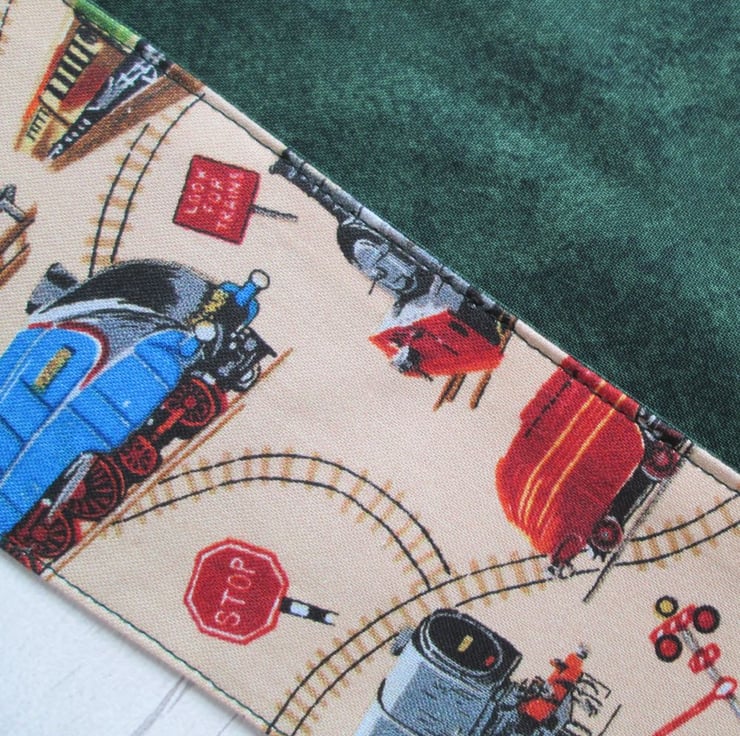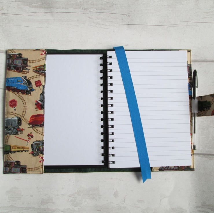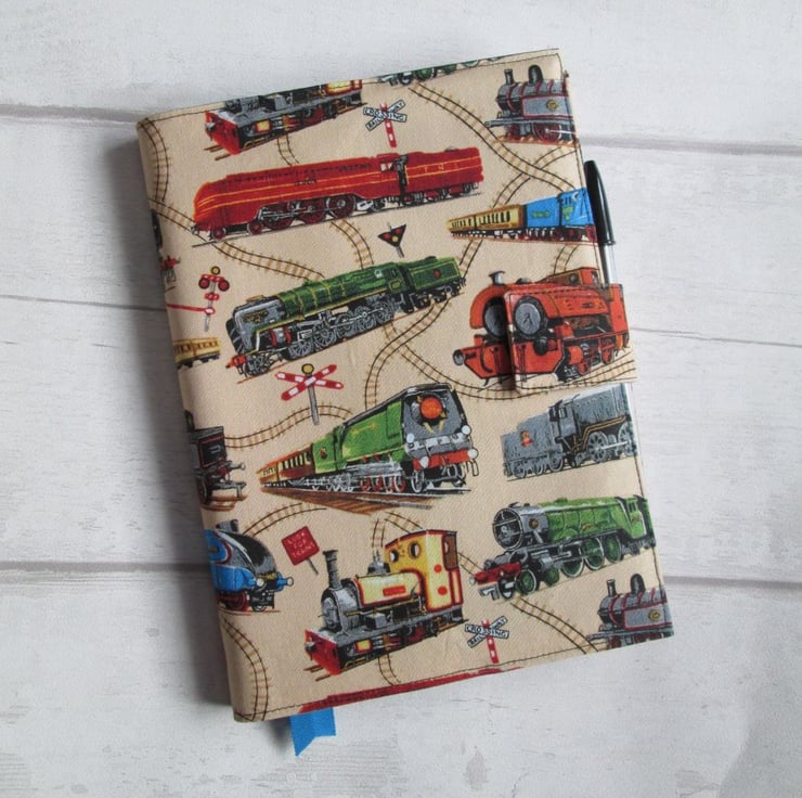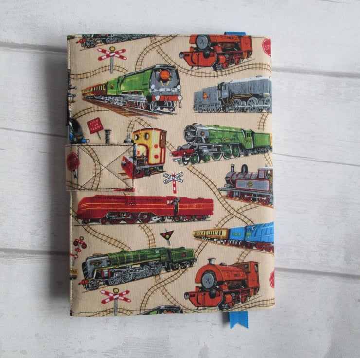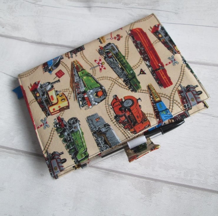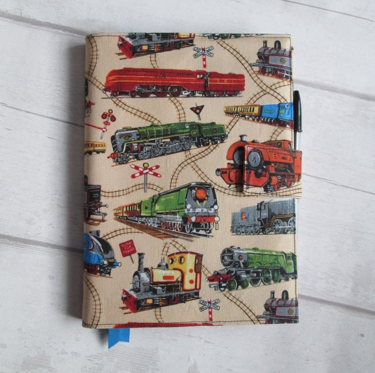 The perfect notebook for a train or model railway enthusiast, featuring a range of classic steam engines including the Mallard, the Flying Scotsman, the Duchess of Hamilton and the Golden Arrow. Lined with dark green cotton, the reusable notebook cover incorporates a ribbon place marker, elastic pen holder and magnetic strap fastening. It comes complete with a lined notebook and pen ready for use.