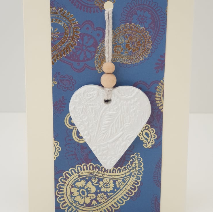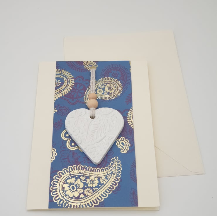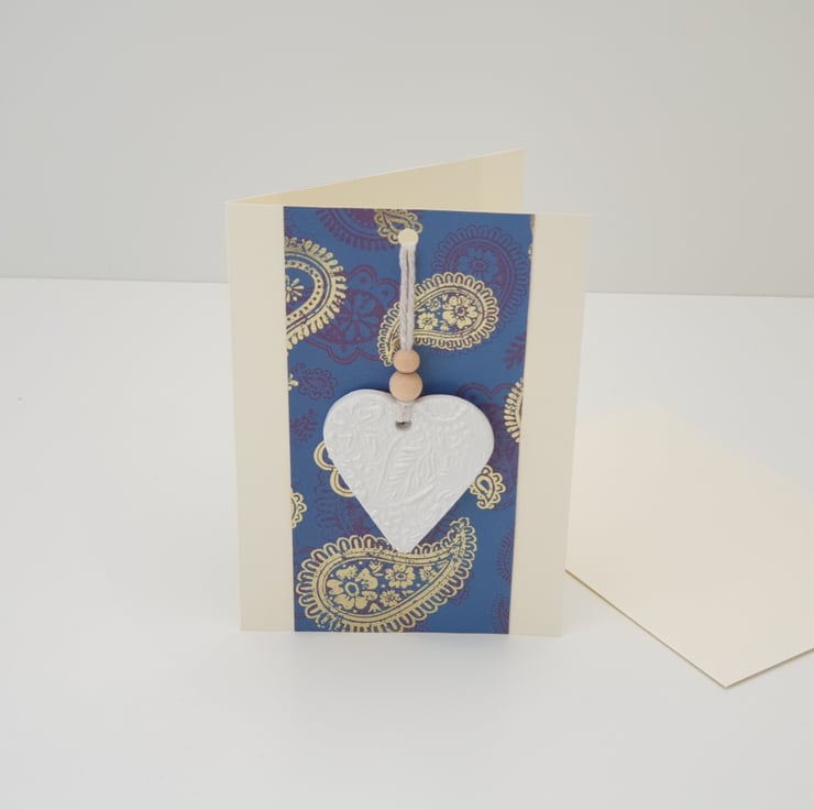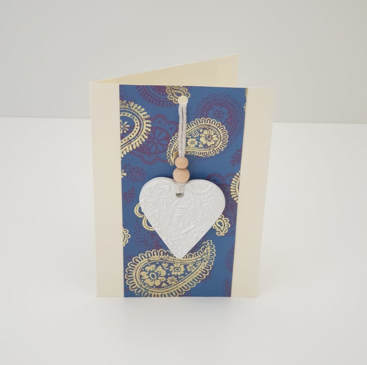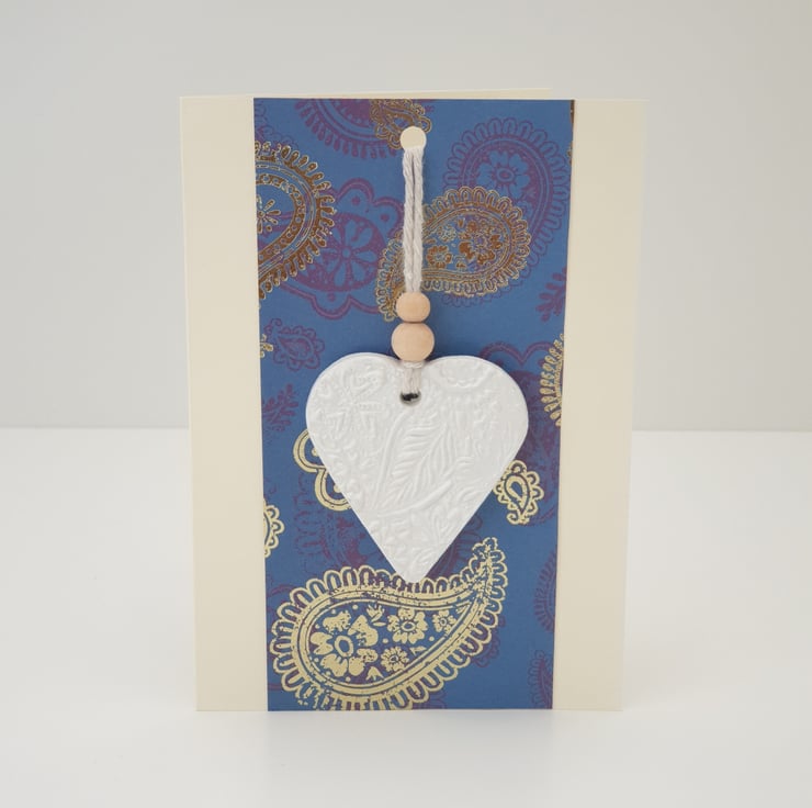A beautiful handmade card to celebrate any occasion with pretty dark blue and gold paisley design paper on cream card and detachable handcrafted white clay heart. The clay heart can be easily detached and hung up as a keepsake.