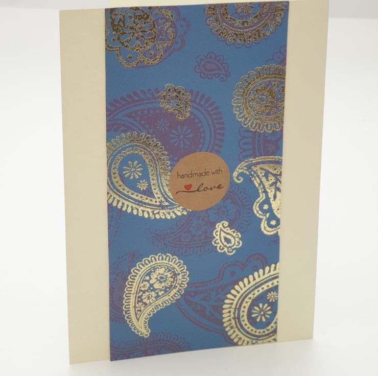 The card has been left blank inside for your own message. The rear of the card has the same pretty paisley paper as the front and a 'handmade with love' sticker.
