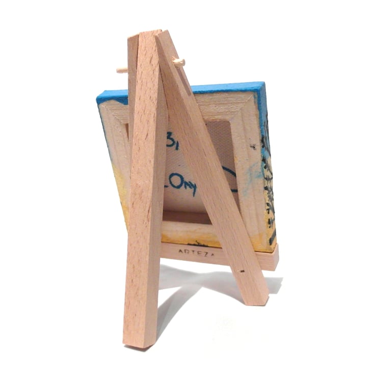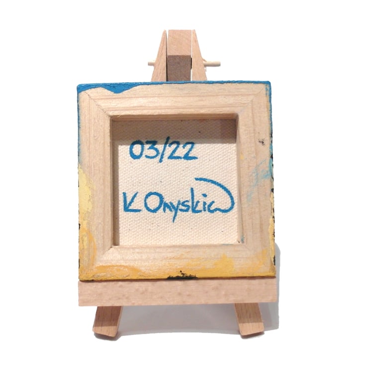 The Ukraine canvas will either come with a 12cm (4.7") wooden easel for display, or will be strung with a ribbon in a colour that matches the painting so it can be hung on a wall (as in picture 9). Just choose with easel or ribbon hanging when you buy.