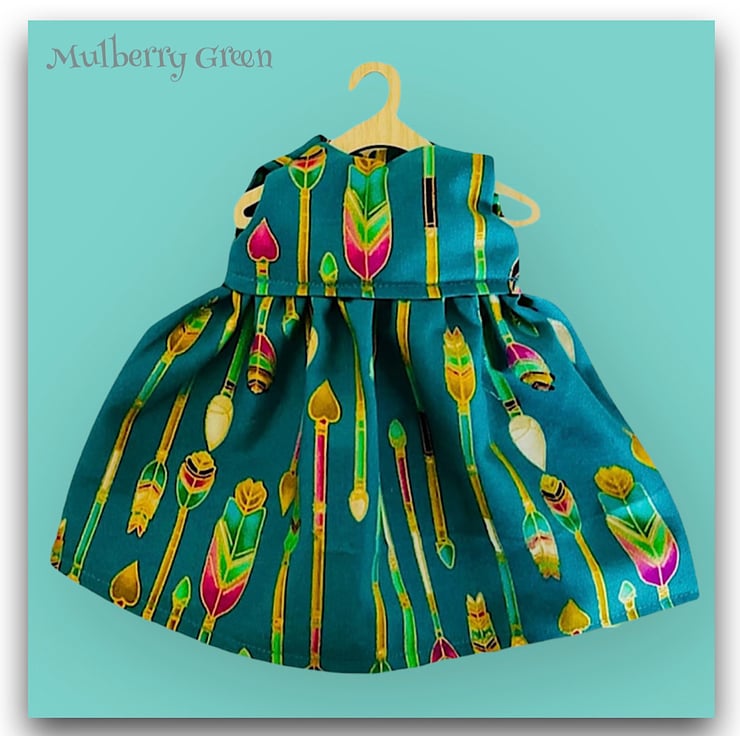 A beautiful dress in a turquoise and purple print, etched with gold, to fit the Mulberry Green characters. The dress is made from best quality cotton, has a full skirt and a lined bodice.