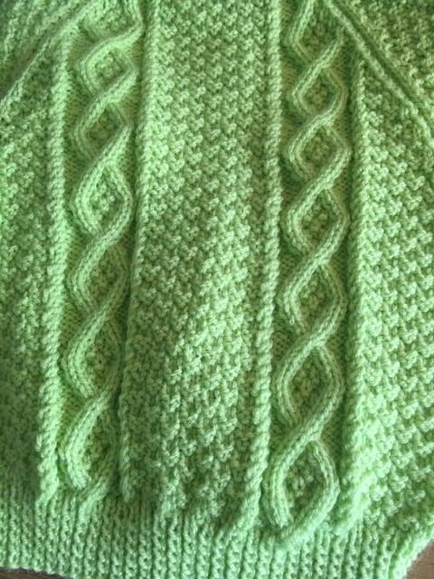 This aran style cardigan is hand knitted in spring green double knitting wool from Marriners. With traditional diamond and cable pattern,and finished with matching buttons, this will fit a child aged 3 to 4 years and will keep them cosy and warm.