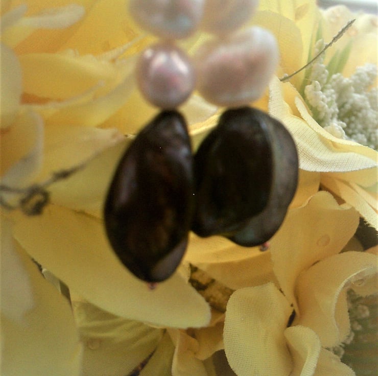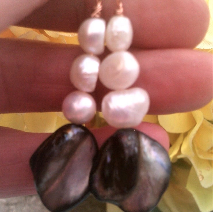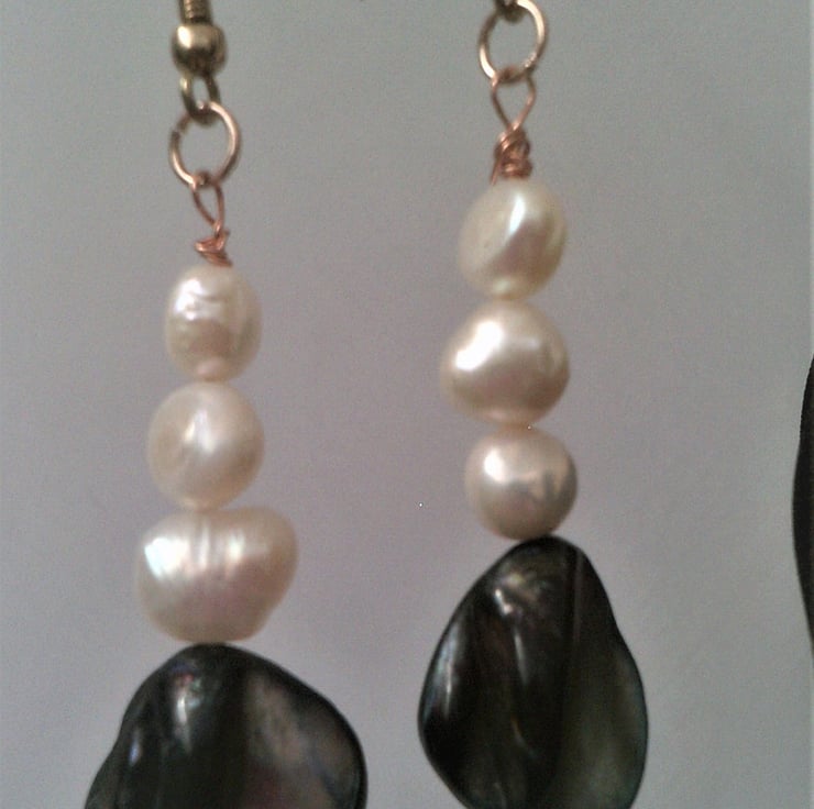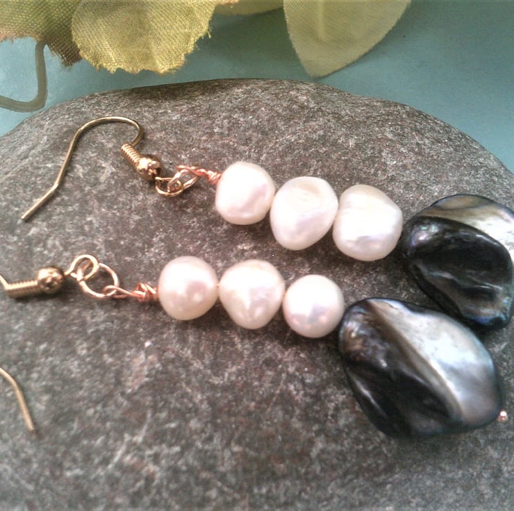 These are rustic black/grey mother of pearl shells, which have natural bumps and lumps which I think are beautiful, with three white freshwater pearls, the pearls are rustic non perfect rounds suspended from rose gold plated shepherd hooks